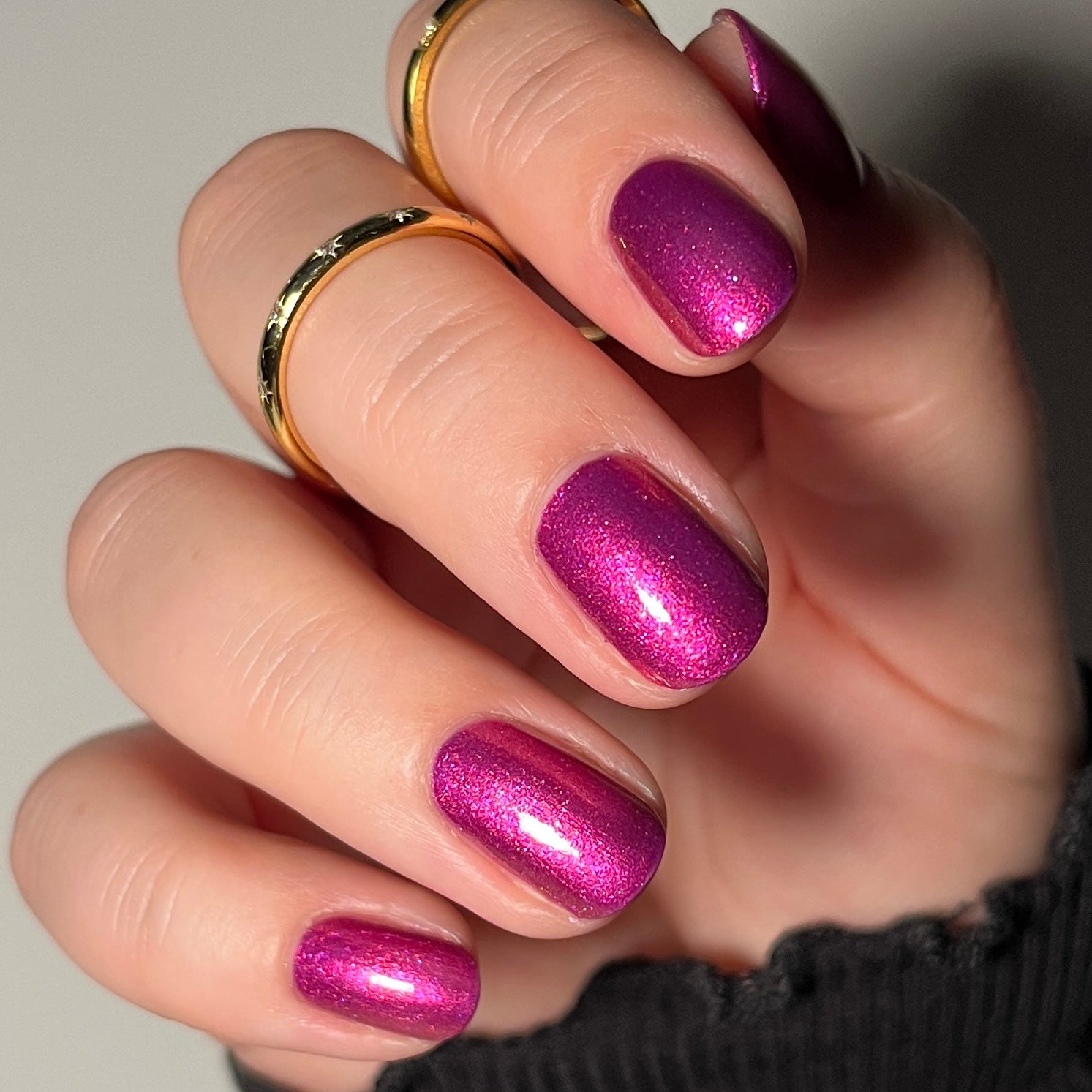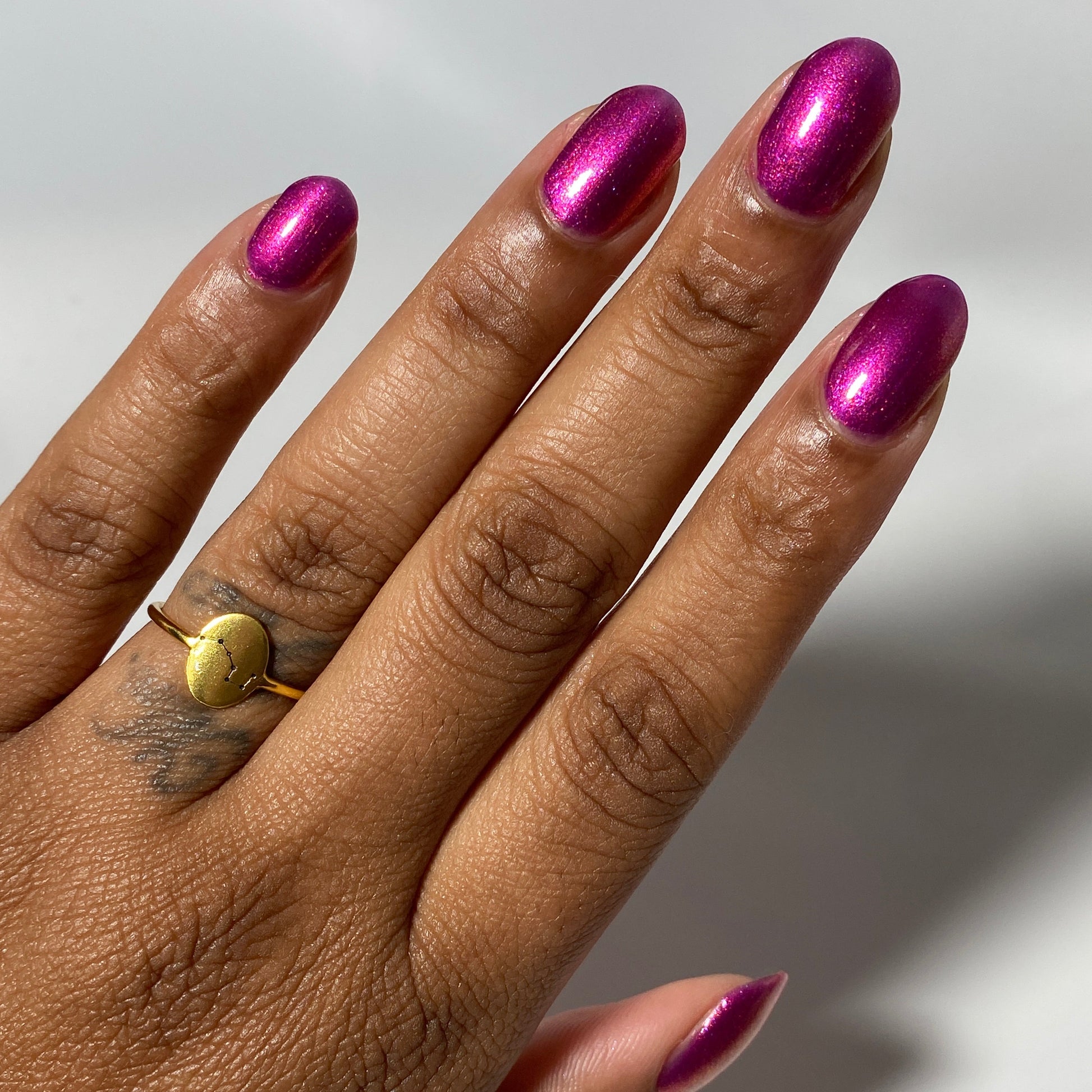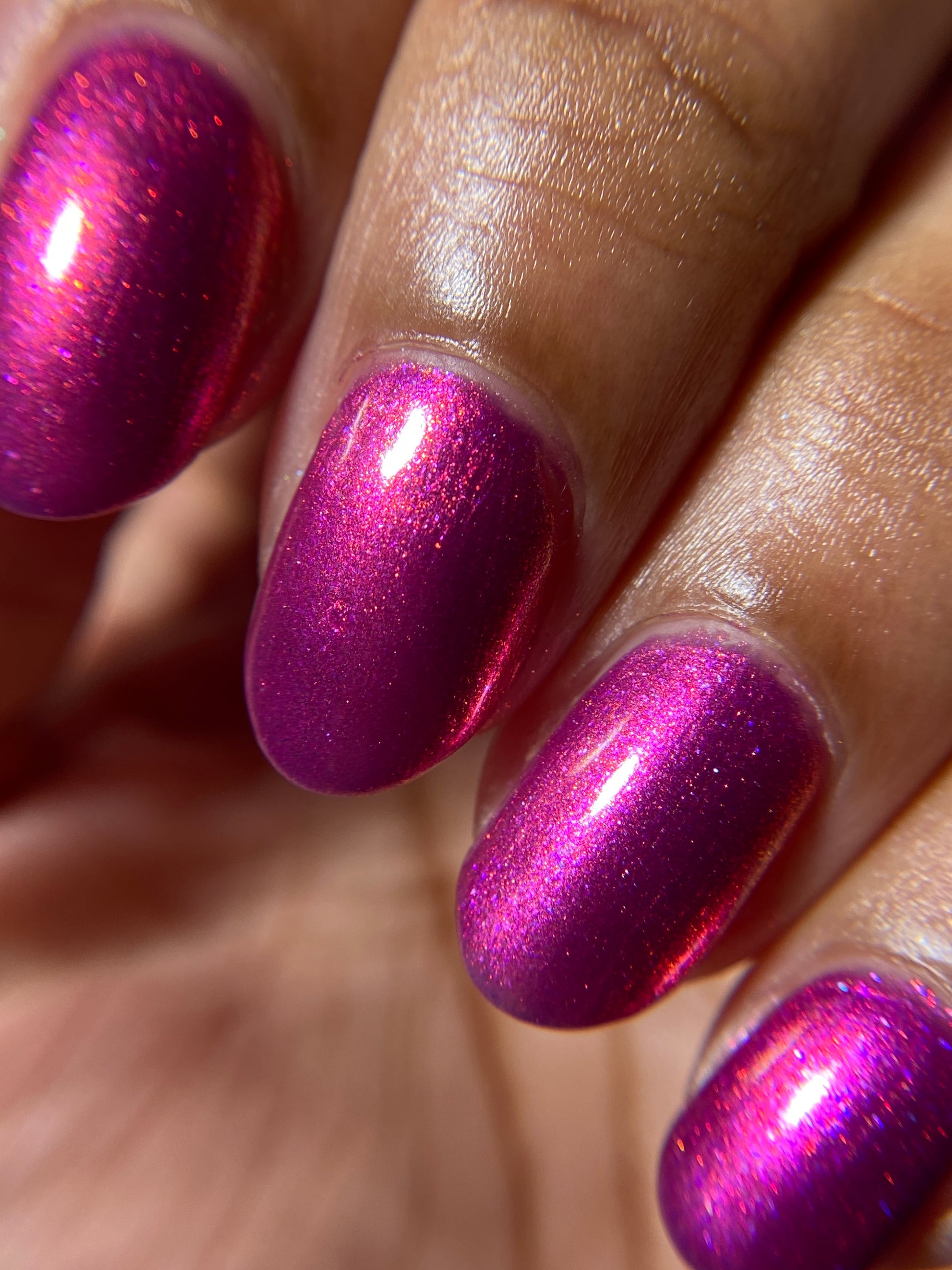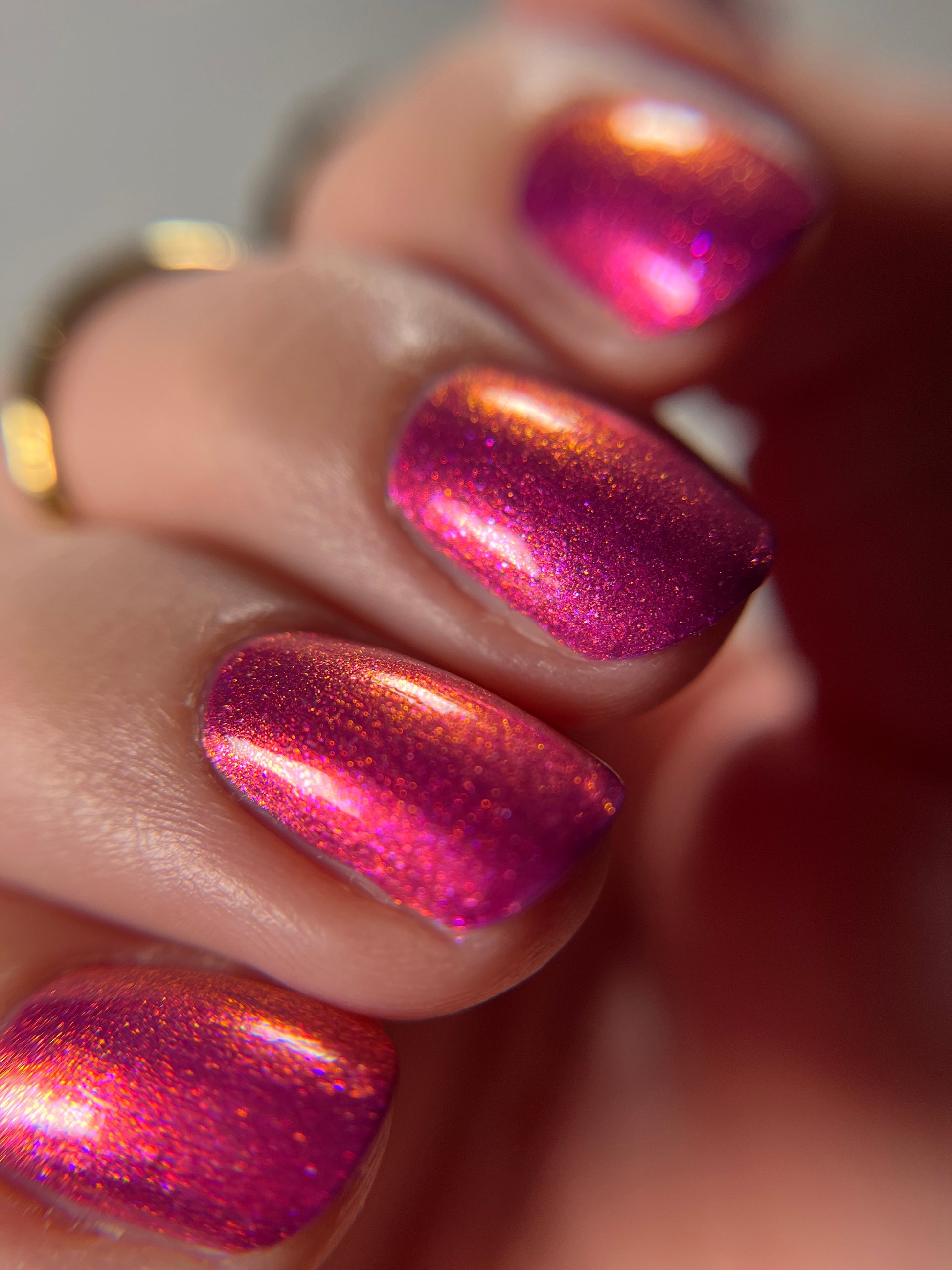 Dragon Daiquiri (Limited Edition) is described as a fierce and fiery fuchsia polish, blazing with the heat of dragon breath. Its shimmer within morphs from molten orange to twilight purple/blue, like scales glinting in flight across a sunset sky.