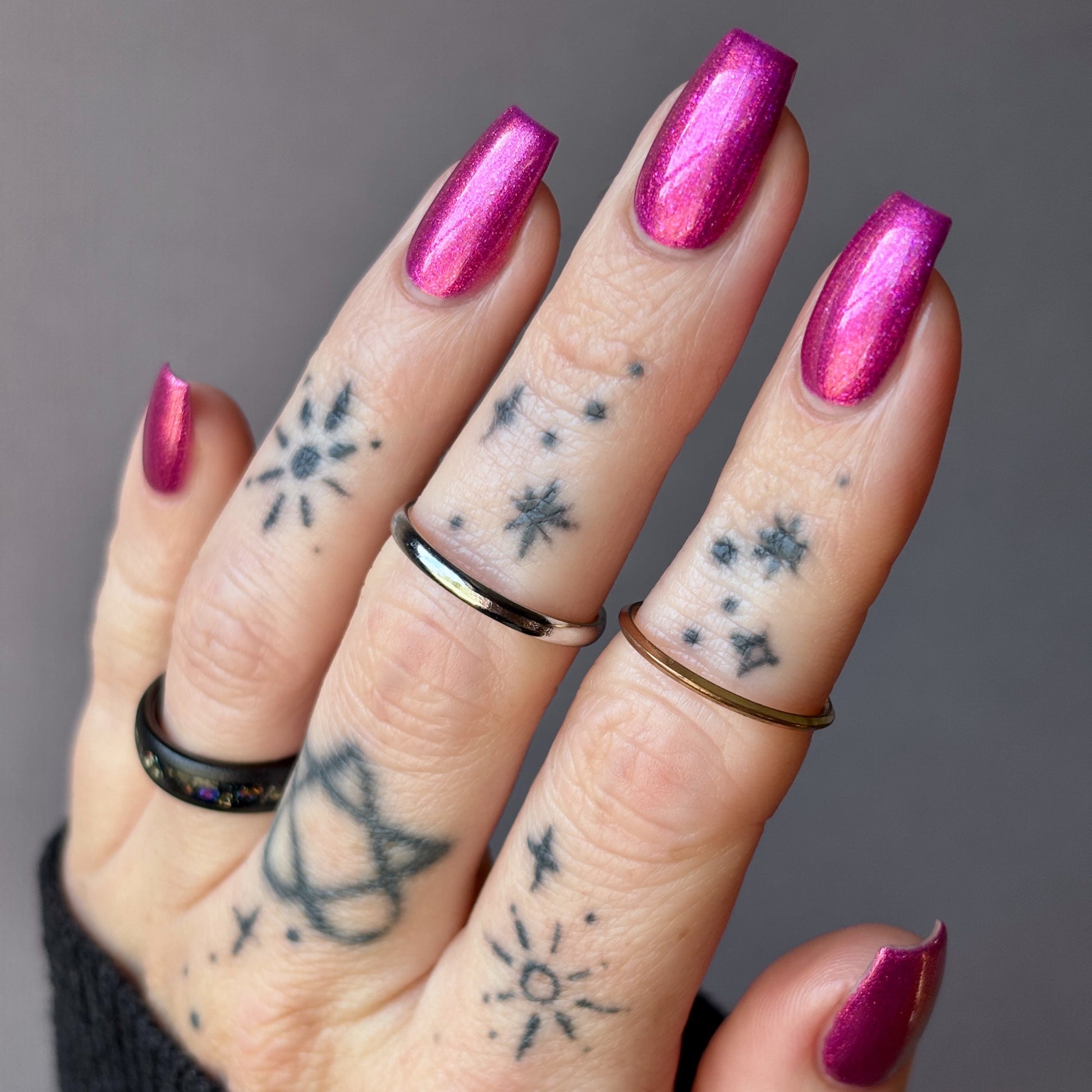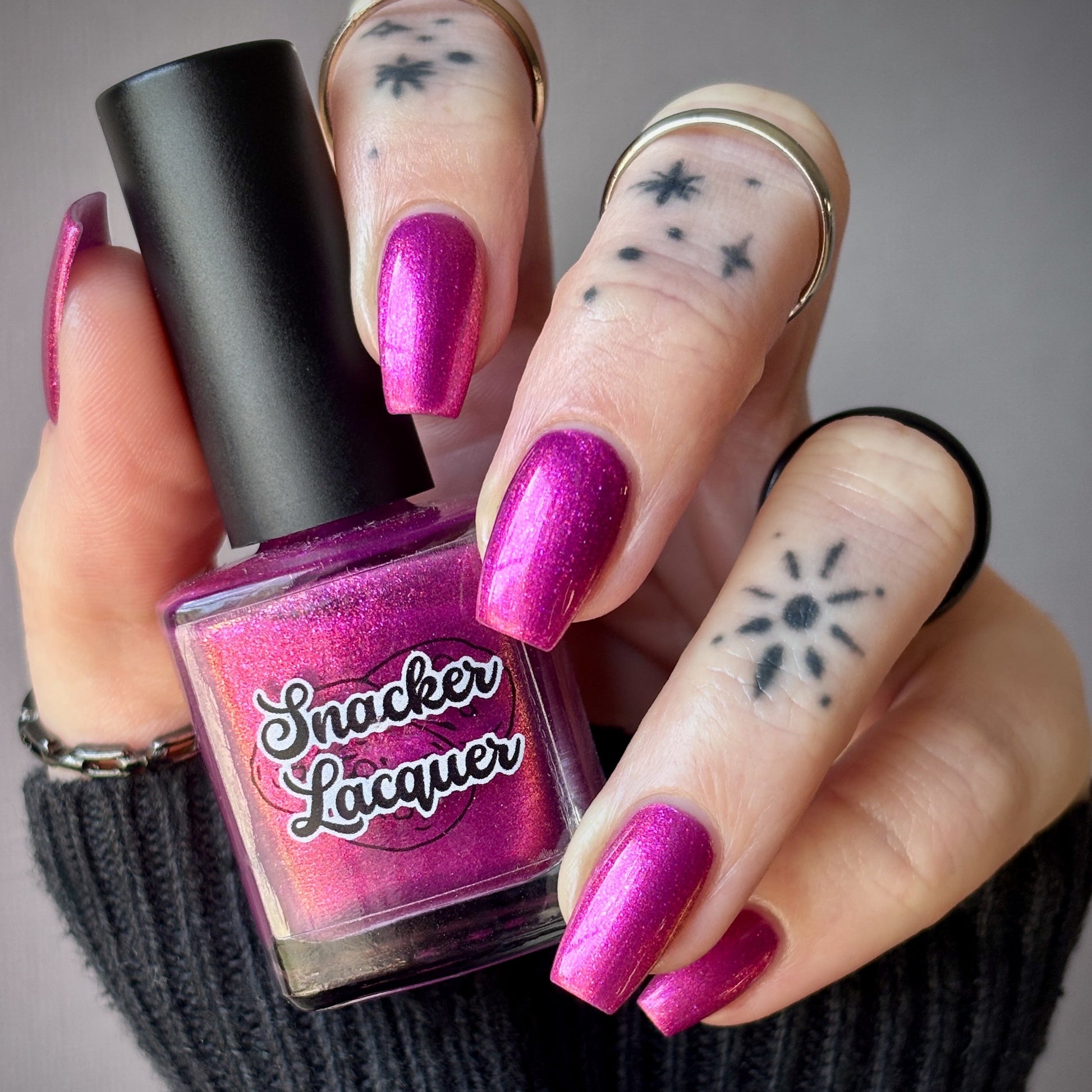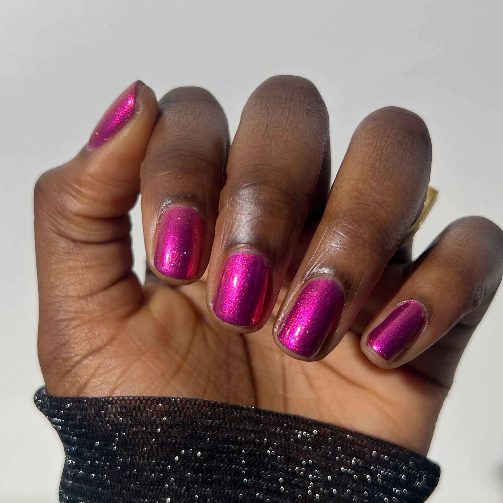 Dragon Daiquiri (Limited Edition) is described as a fierce and fiery fuchsia polish, blazing with the heat of dragon breath. Its shimmer within morphs from molten orange to twilight purple/blue, like scales glinting in flight across a sunset sky.