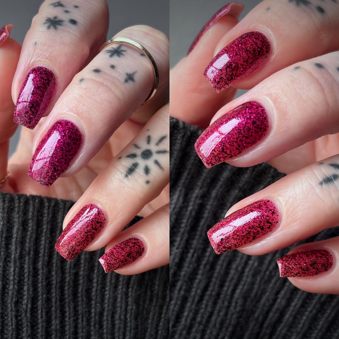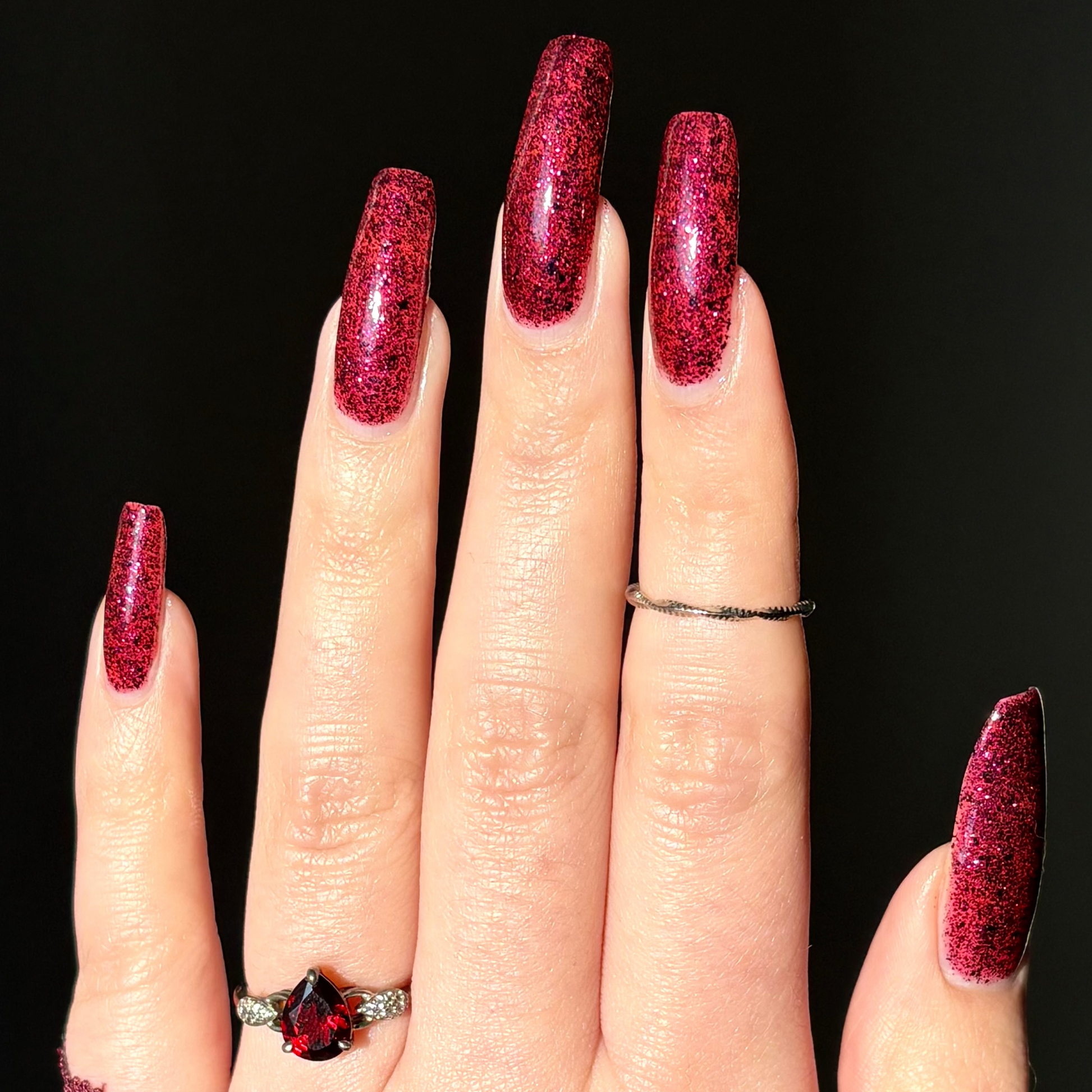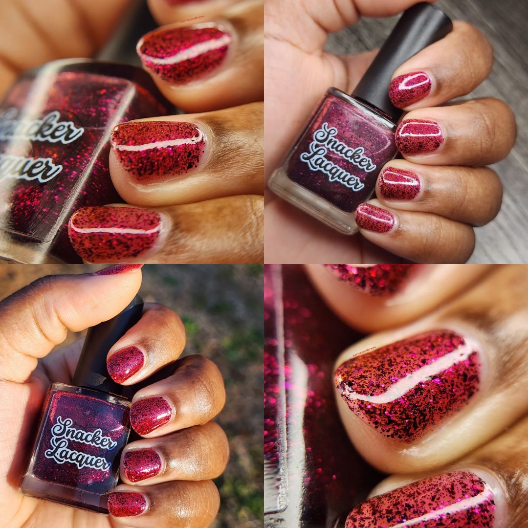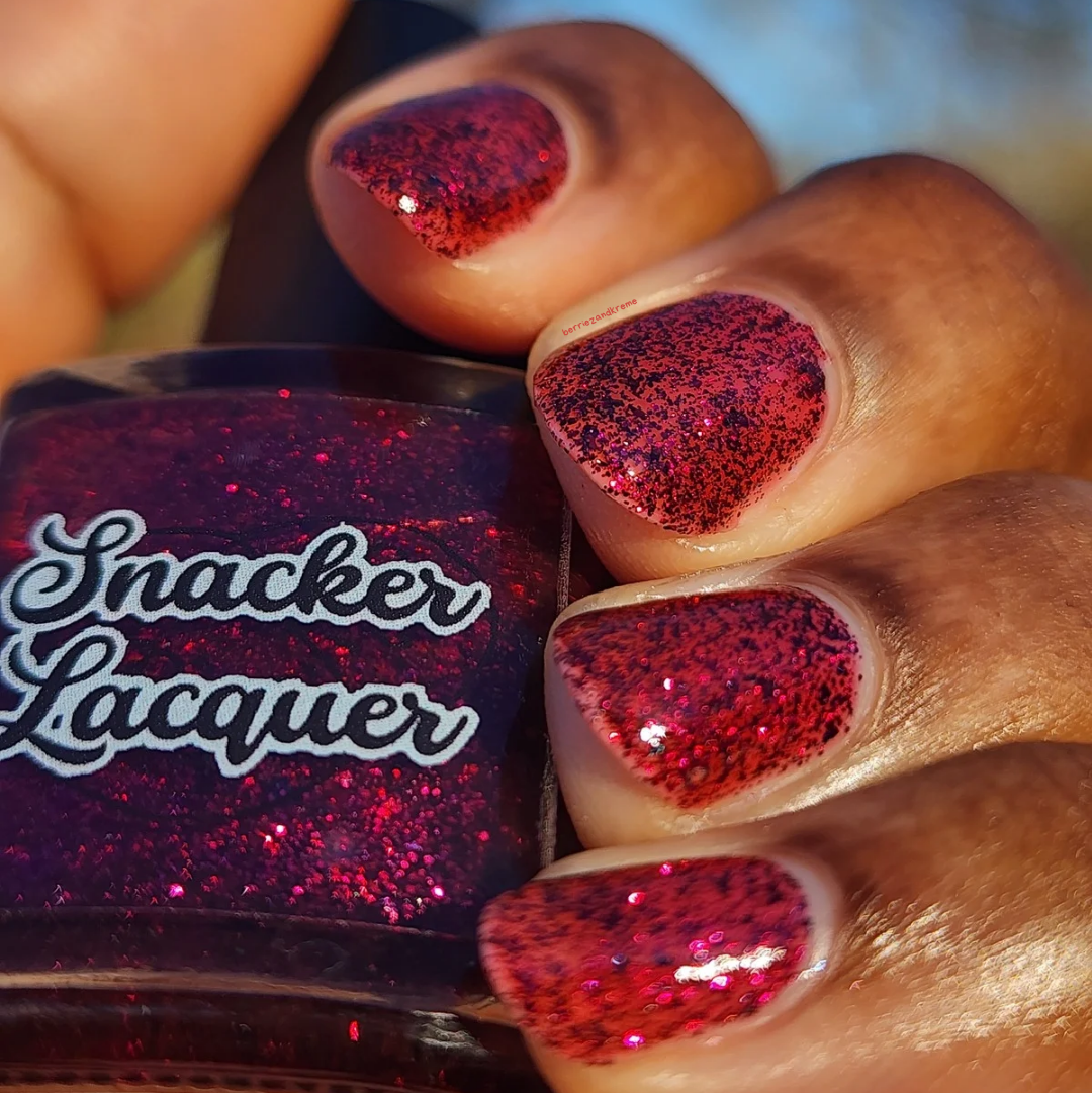 Description: A deep garnet jelly polish with red & black micro flakes and garnet red glitter. (Limited Edition)