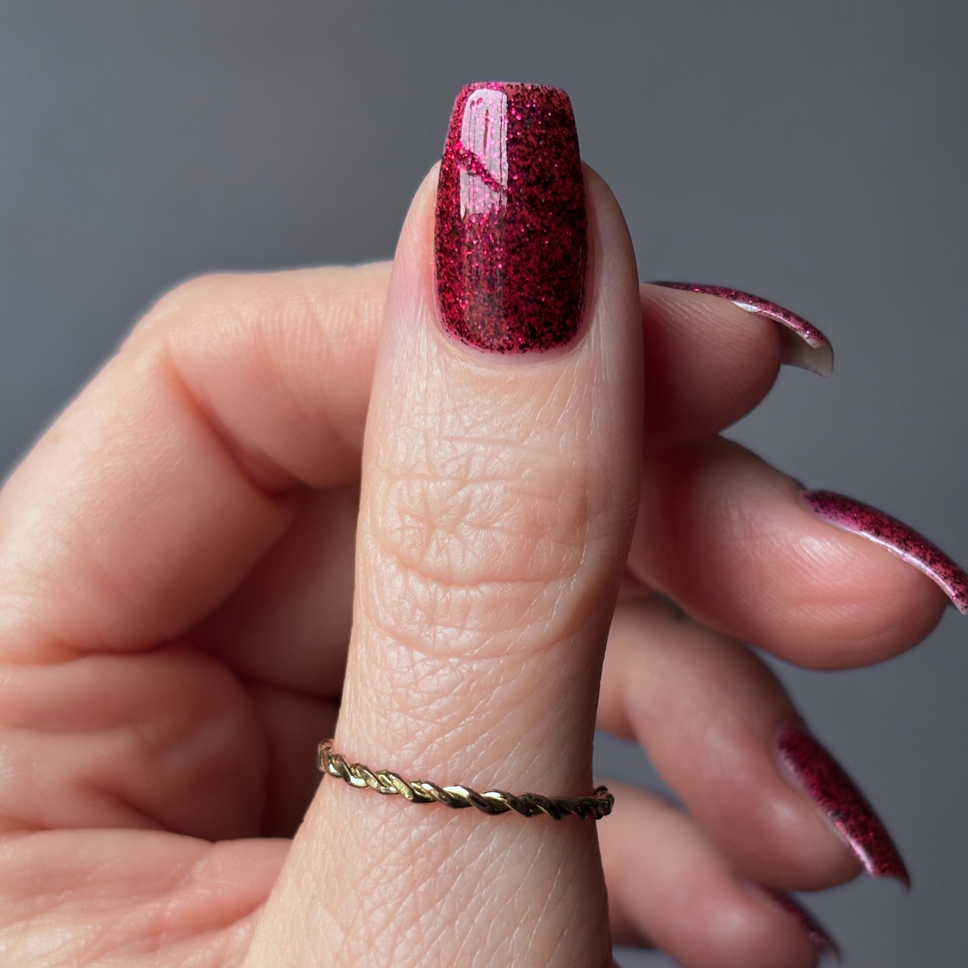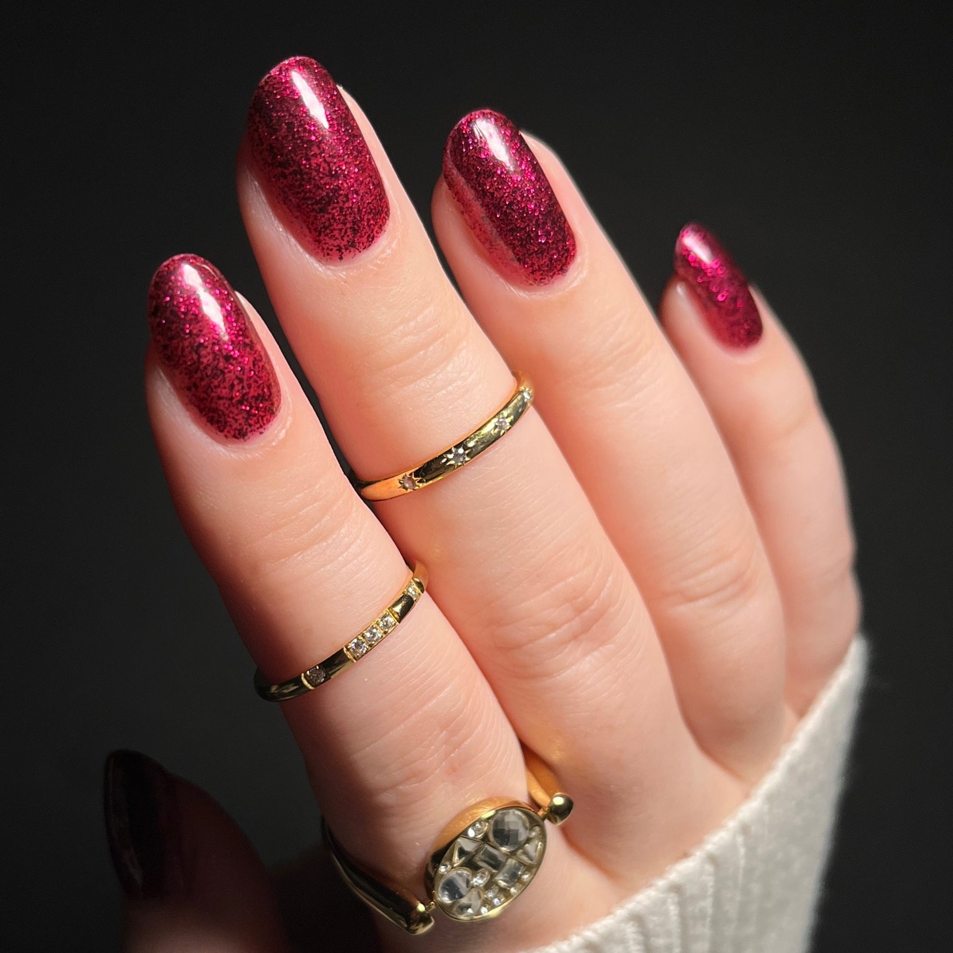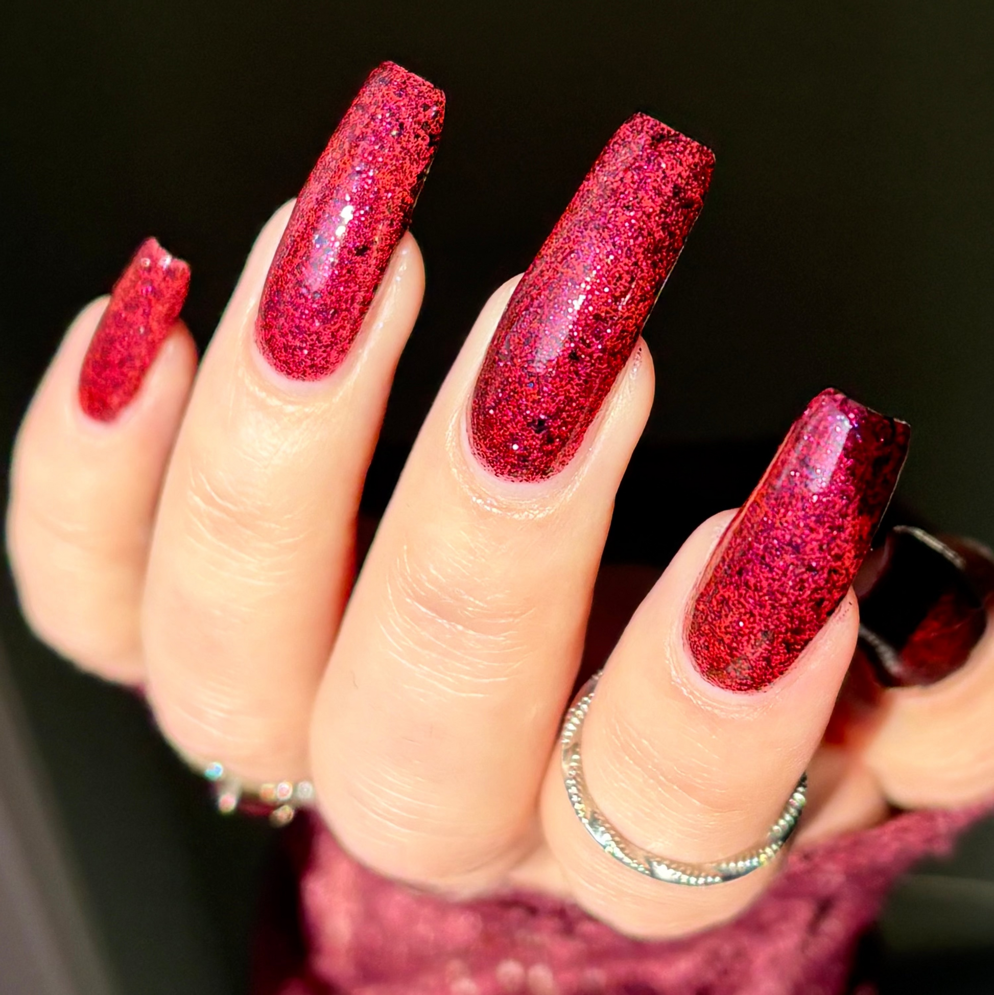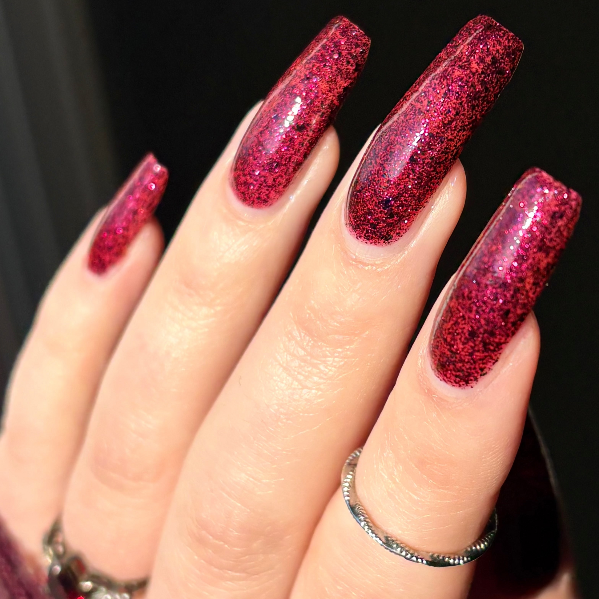 Description: A deep garnet jelly polish with red & black micro flakes and garnet red glitter. (Limited Edition)