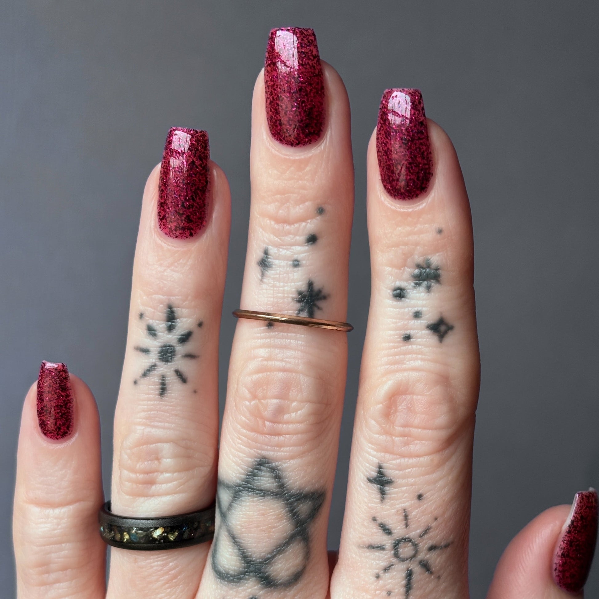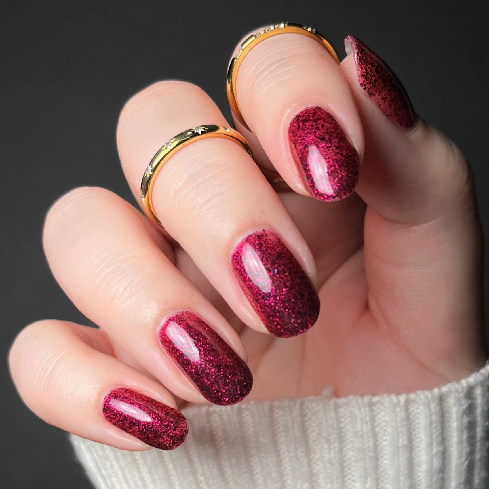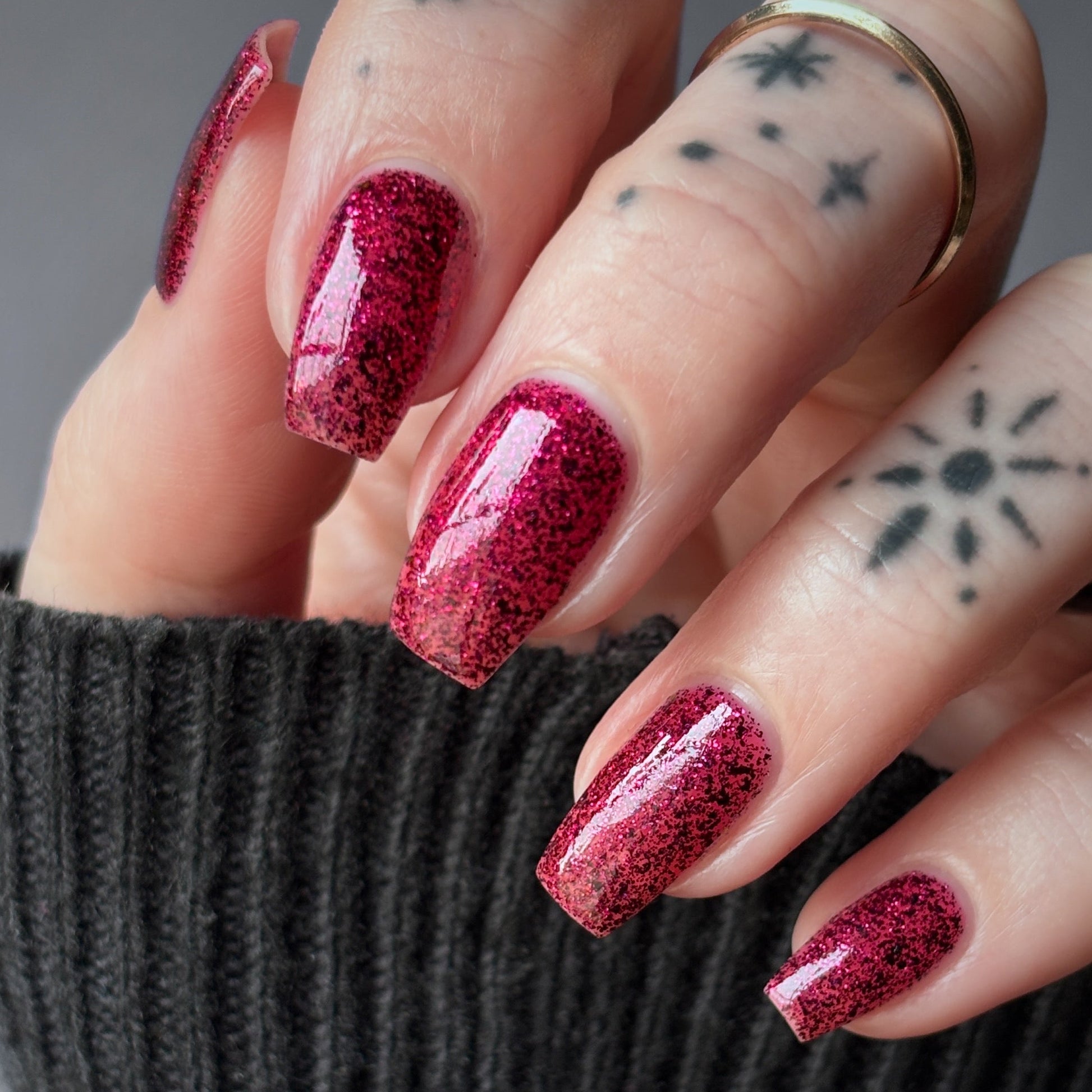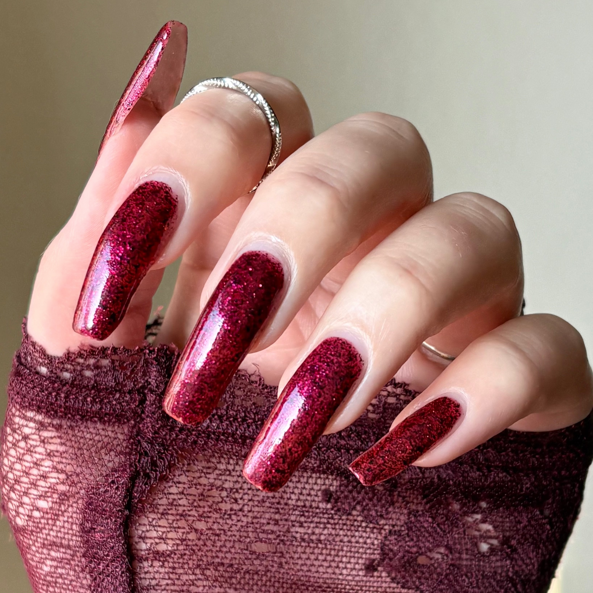 Description: A deep garnet jelly polish with red & black micro flakes and garnet red glitter. (Limited Edition)