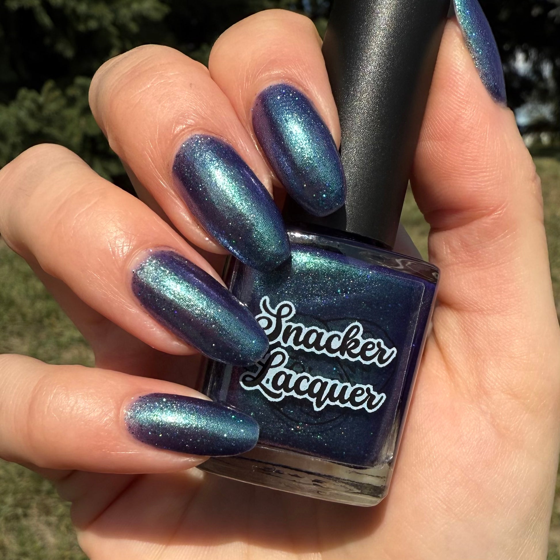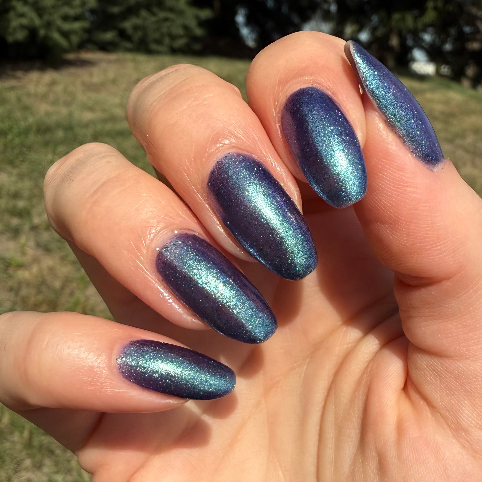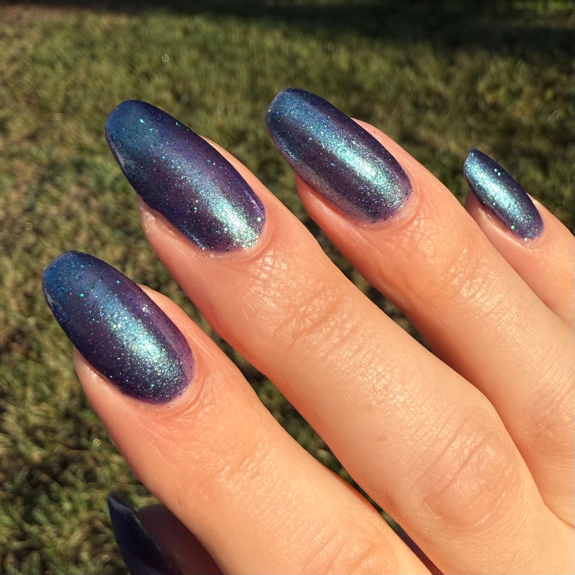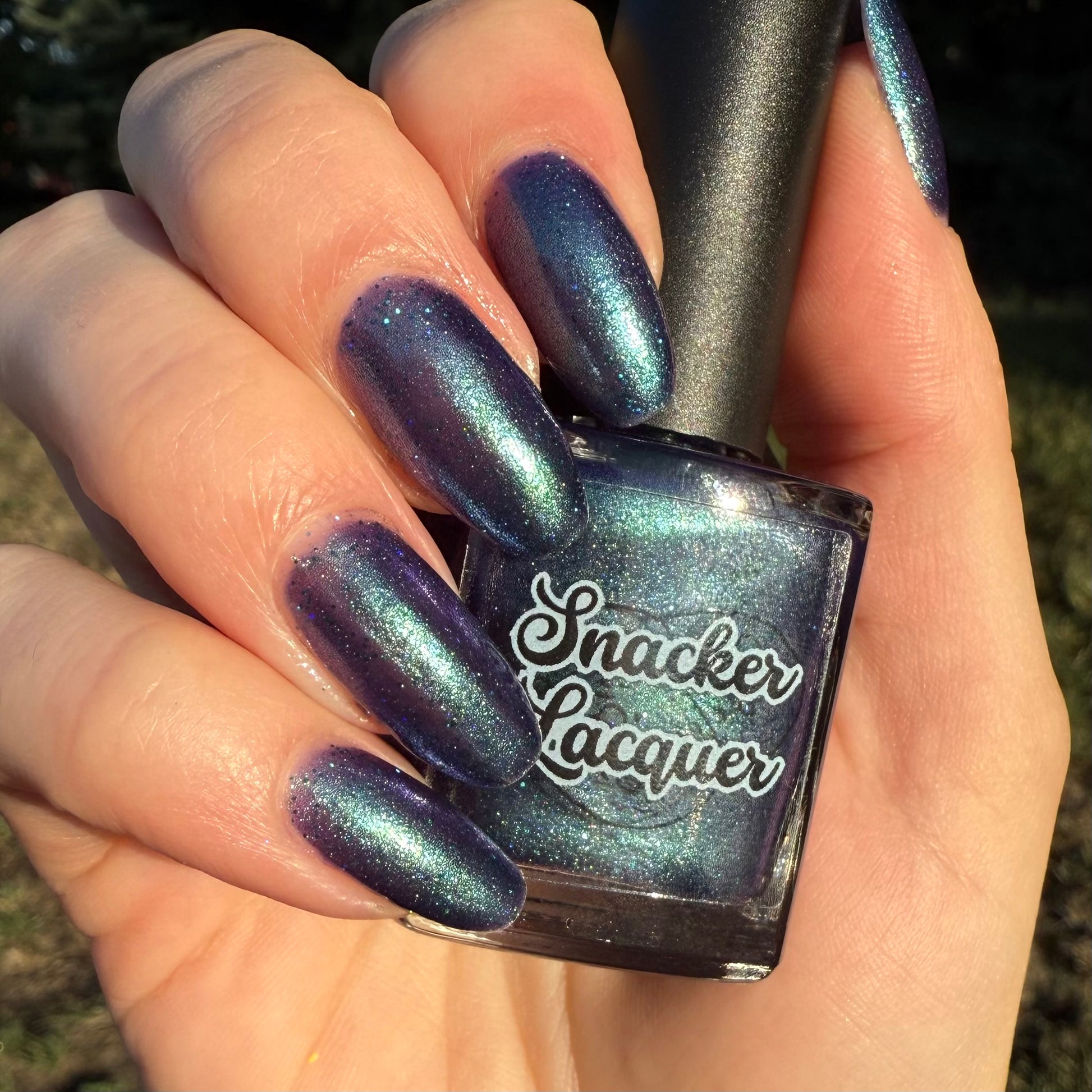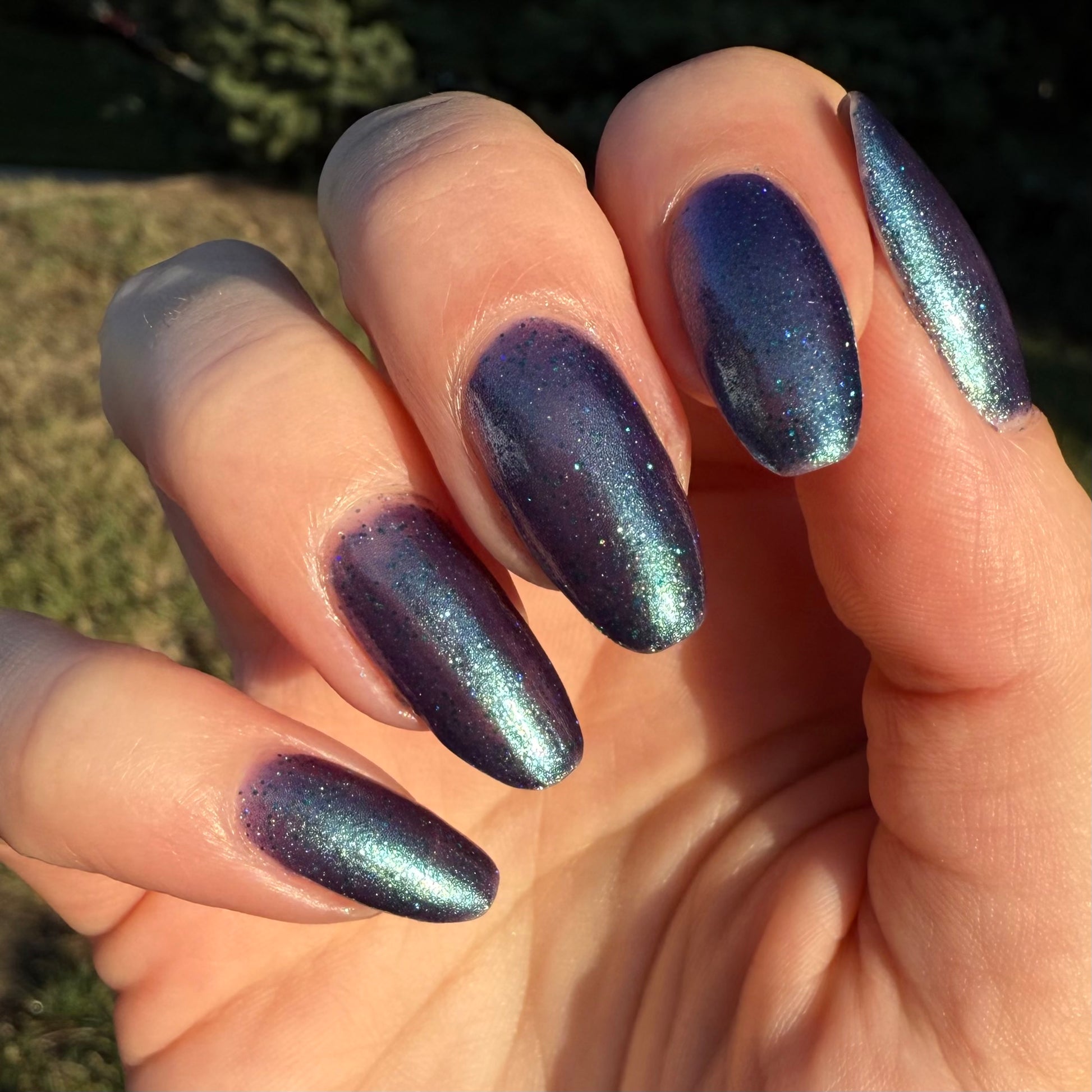 Graveyard Grapevines is described as a deep violet polish with green shimmer, teal holographic glitter, and purple-blue micro flakes. This polish is limited edition!