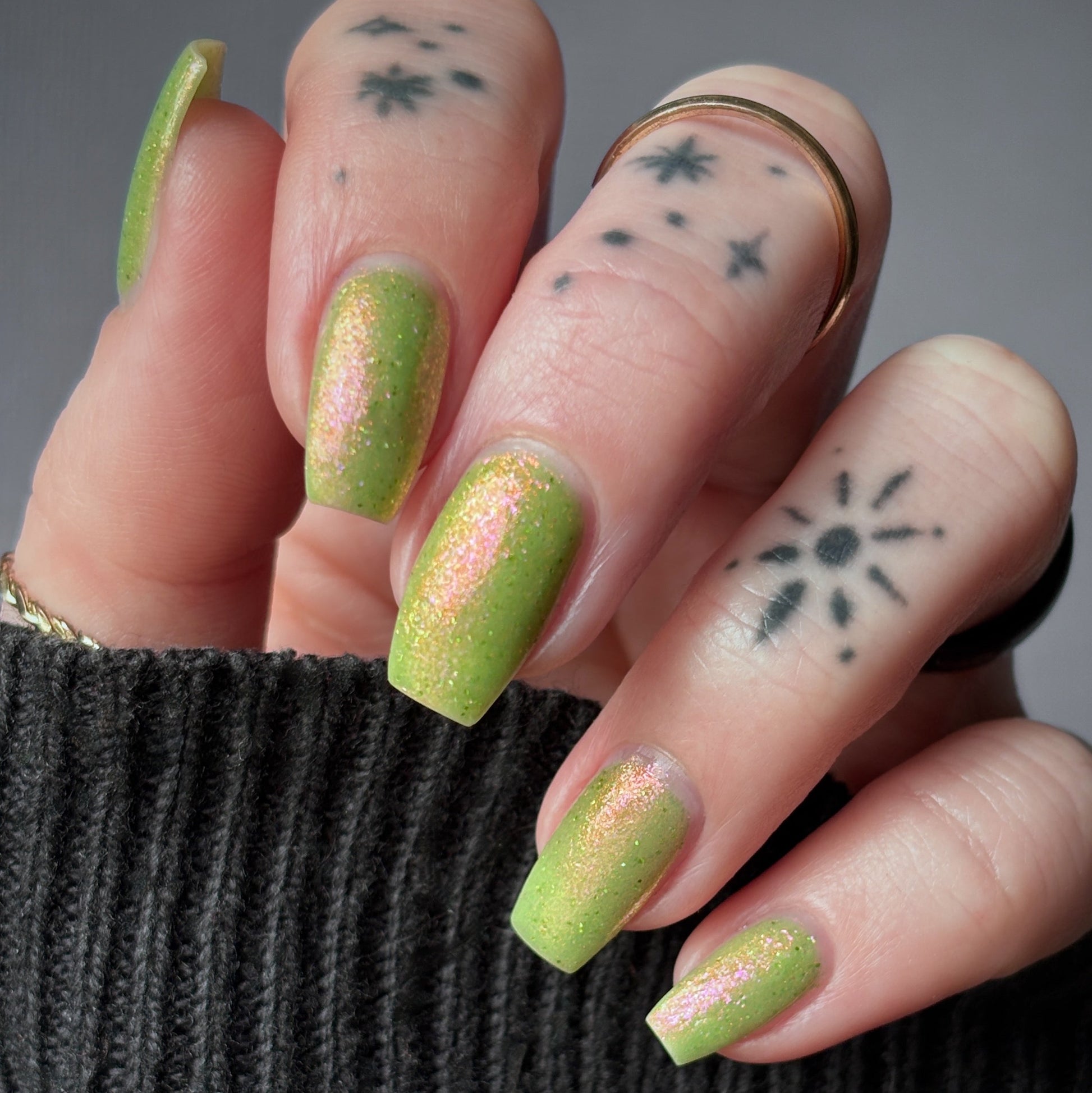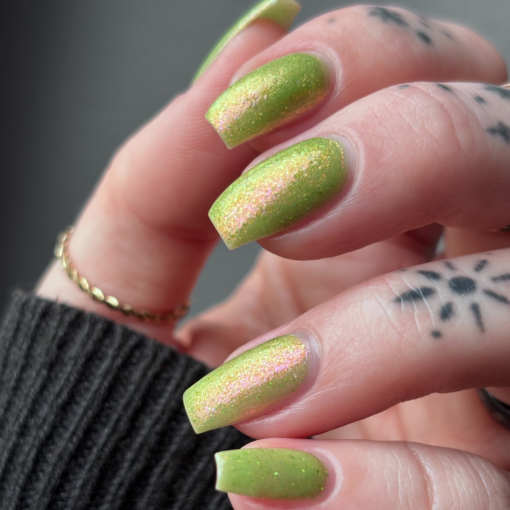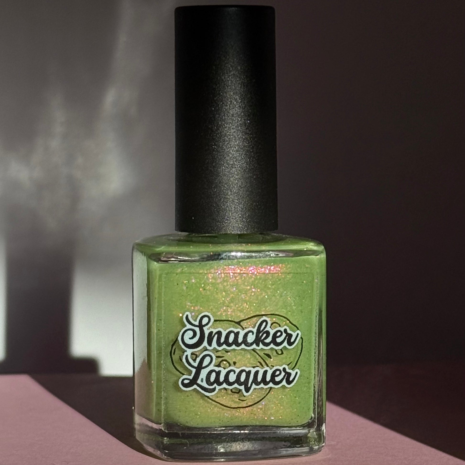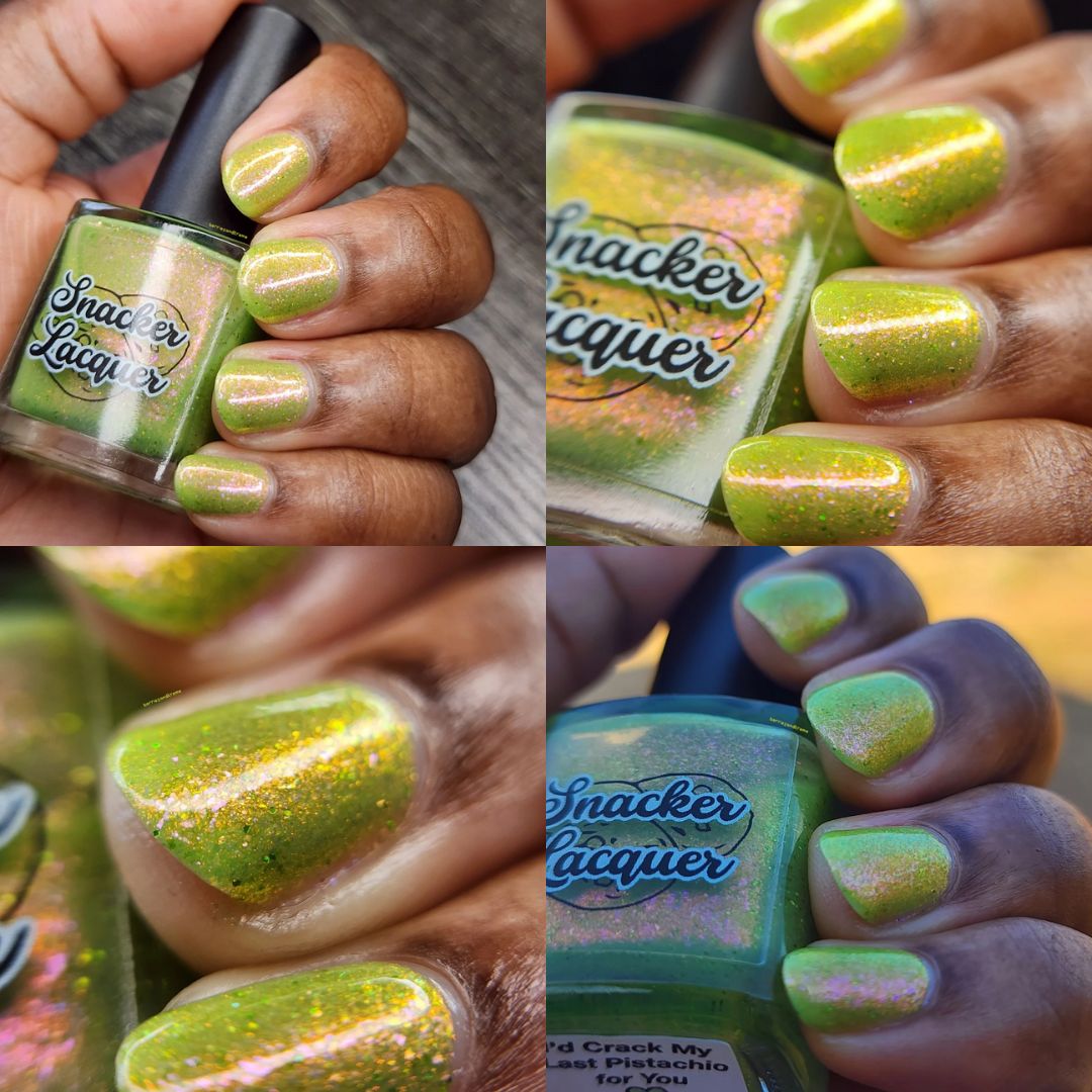 I'd Crack My Last Pistachio for You is described as a light pistachio green with pink/orange shift and green glitter.