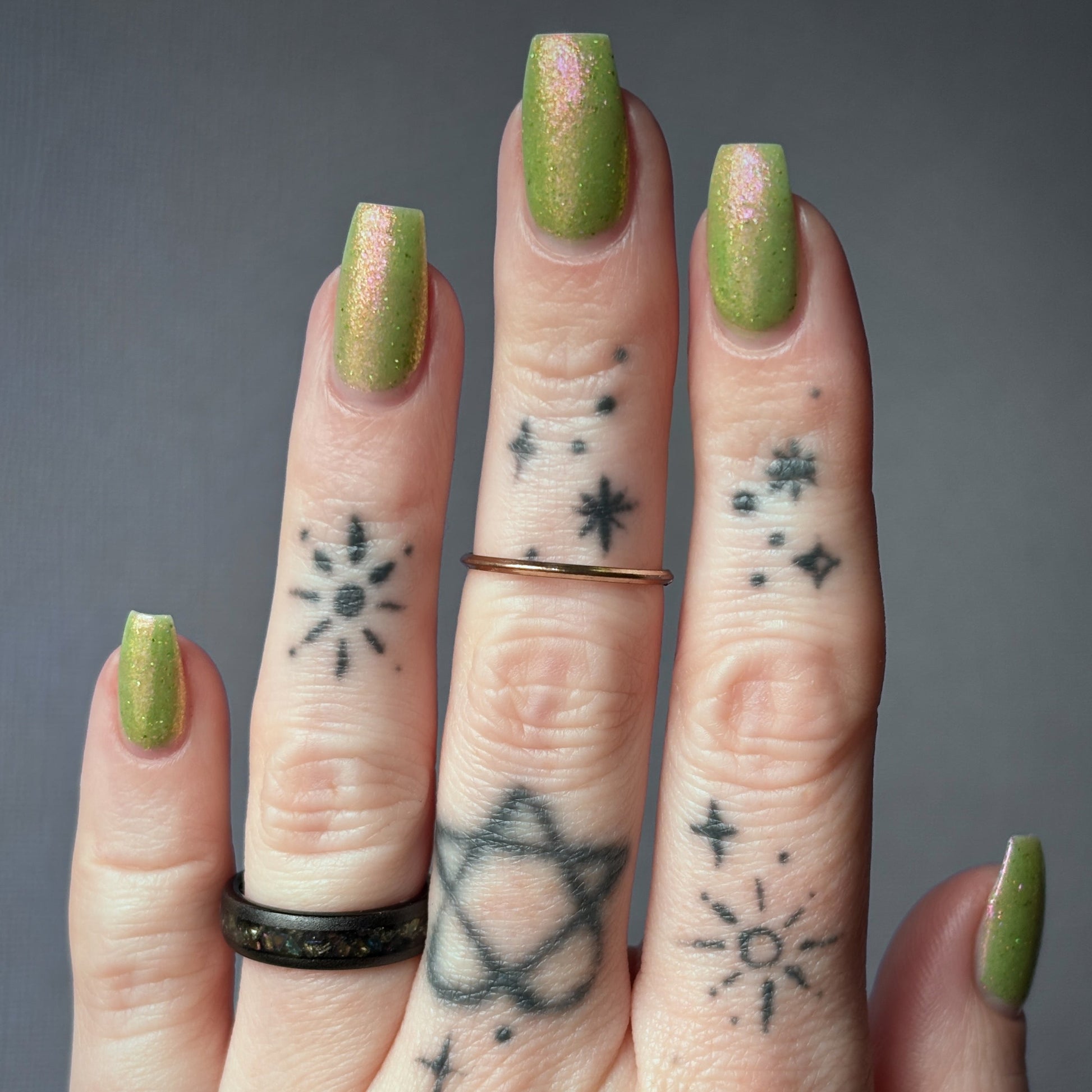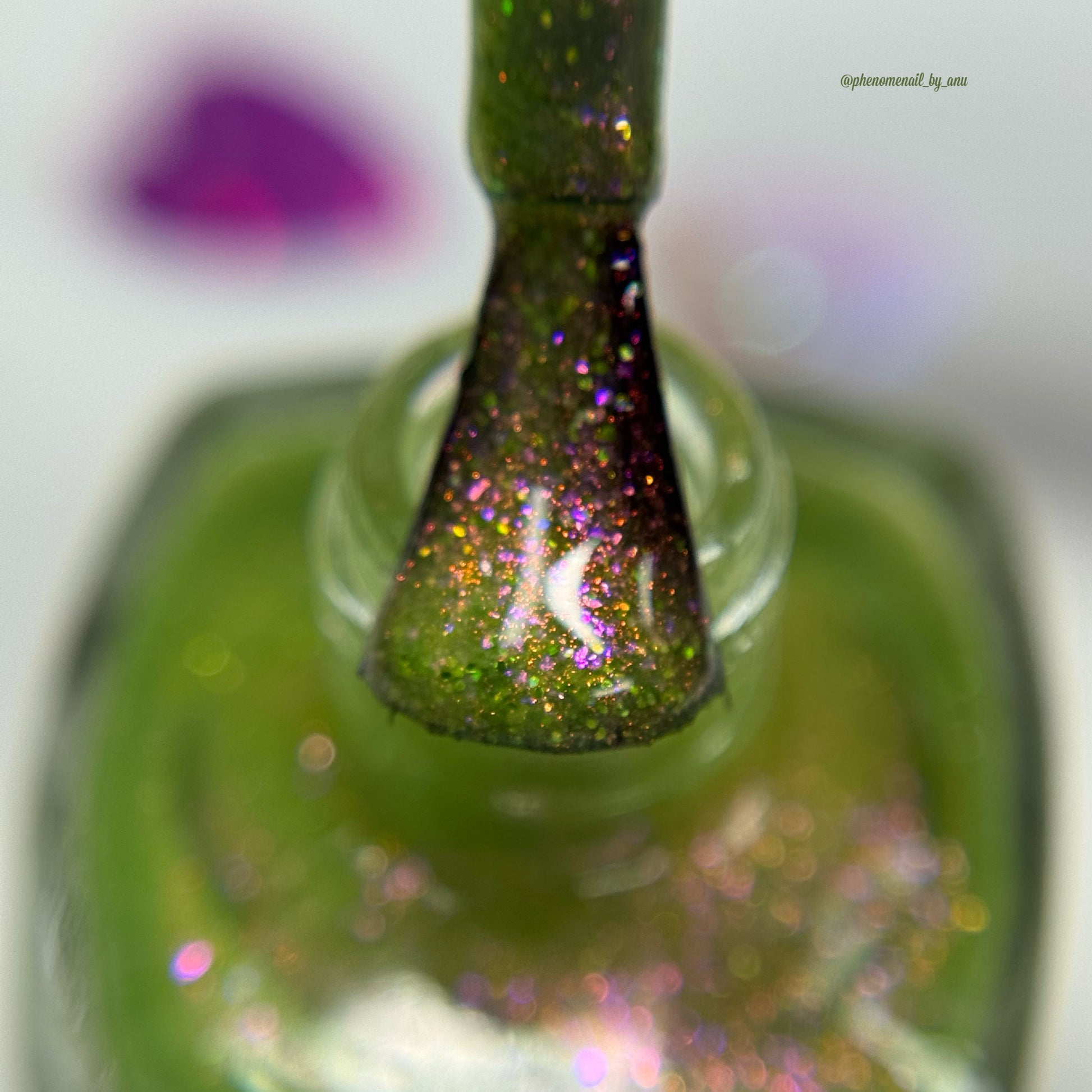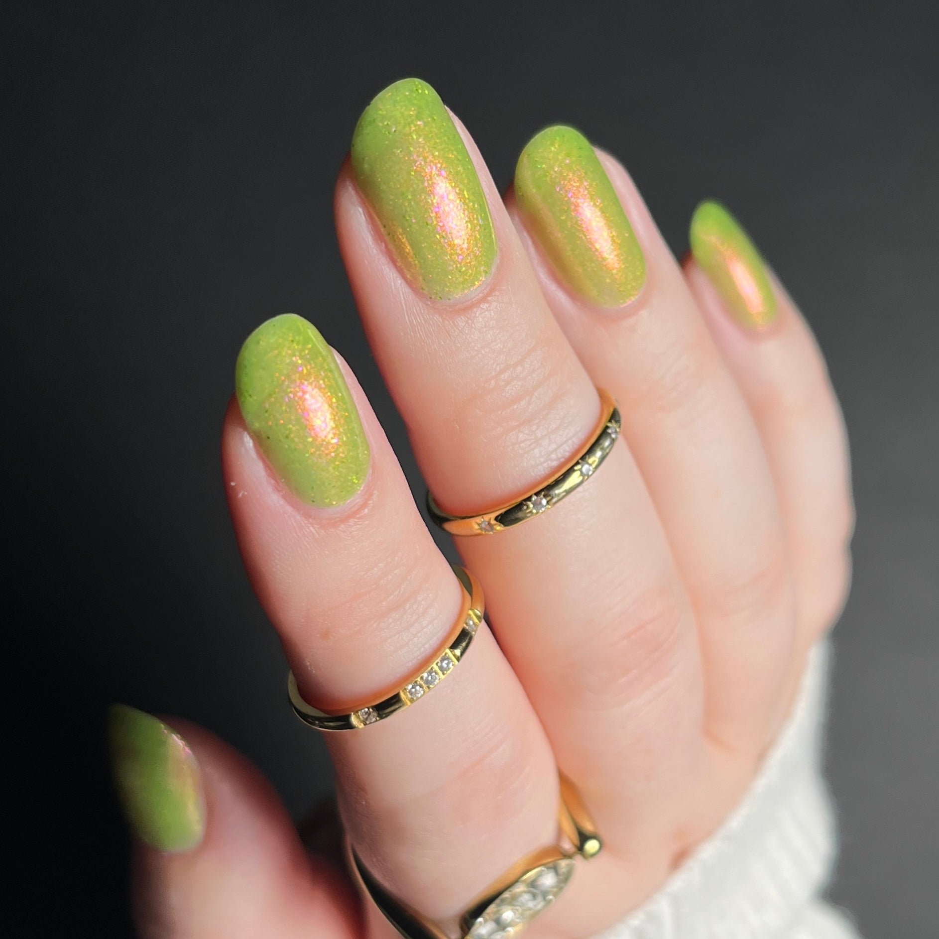 I'd Crack My Last Pistachio for You is described as a light pistachio green with pink/orange shift and green glitter.