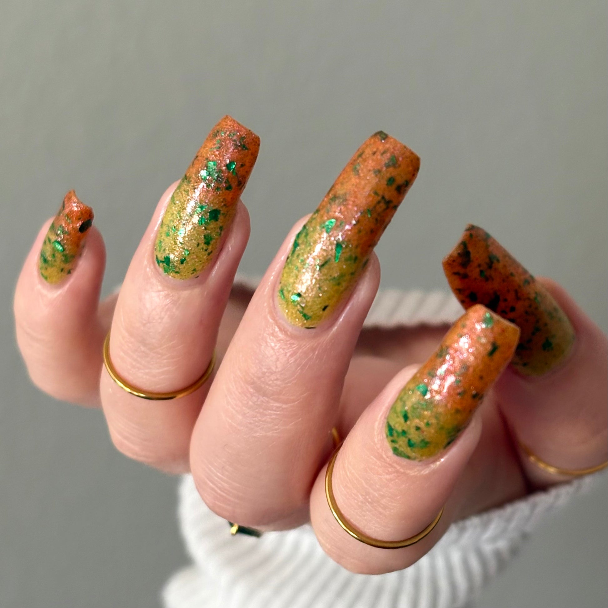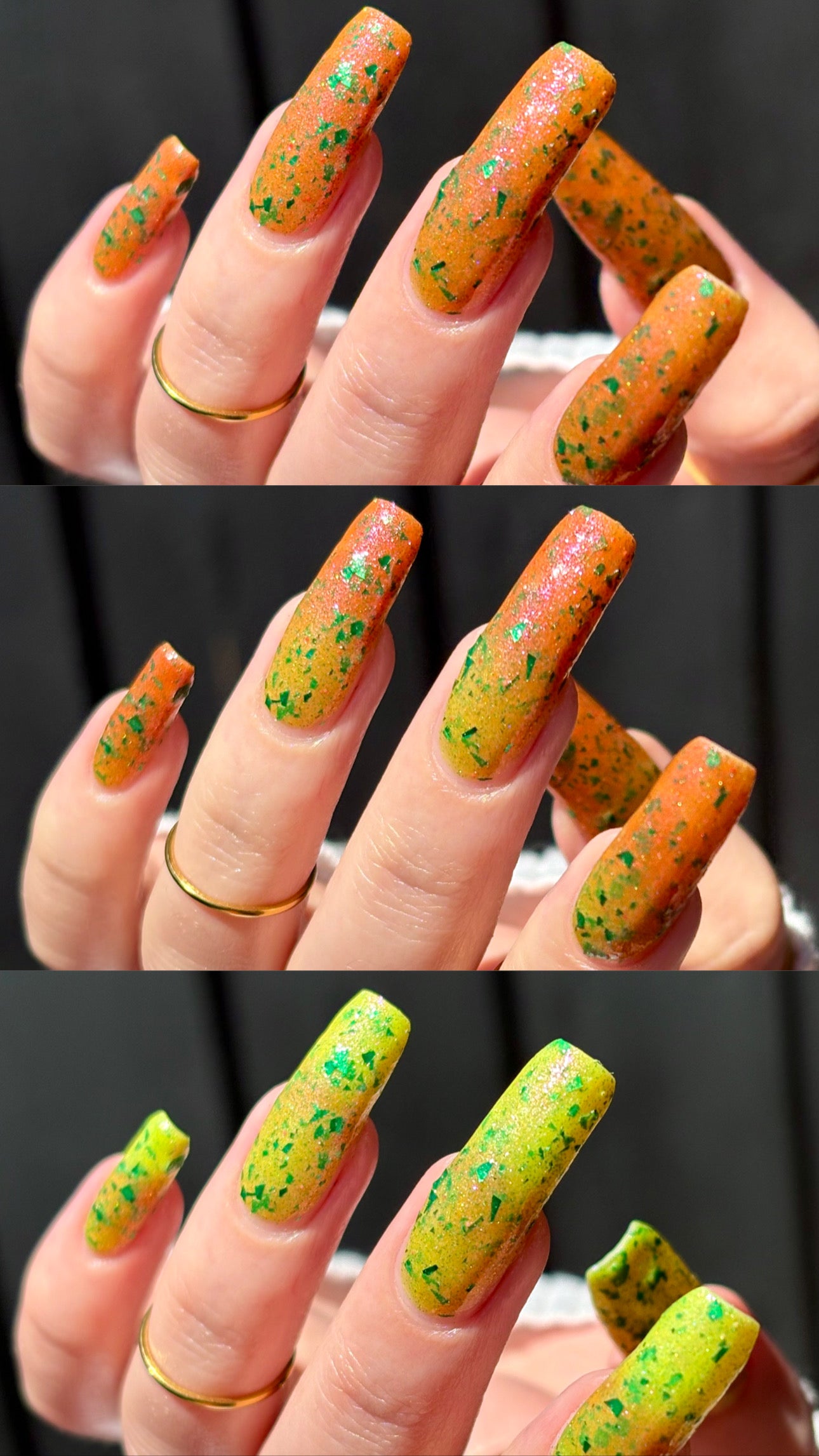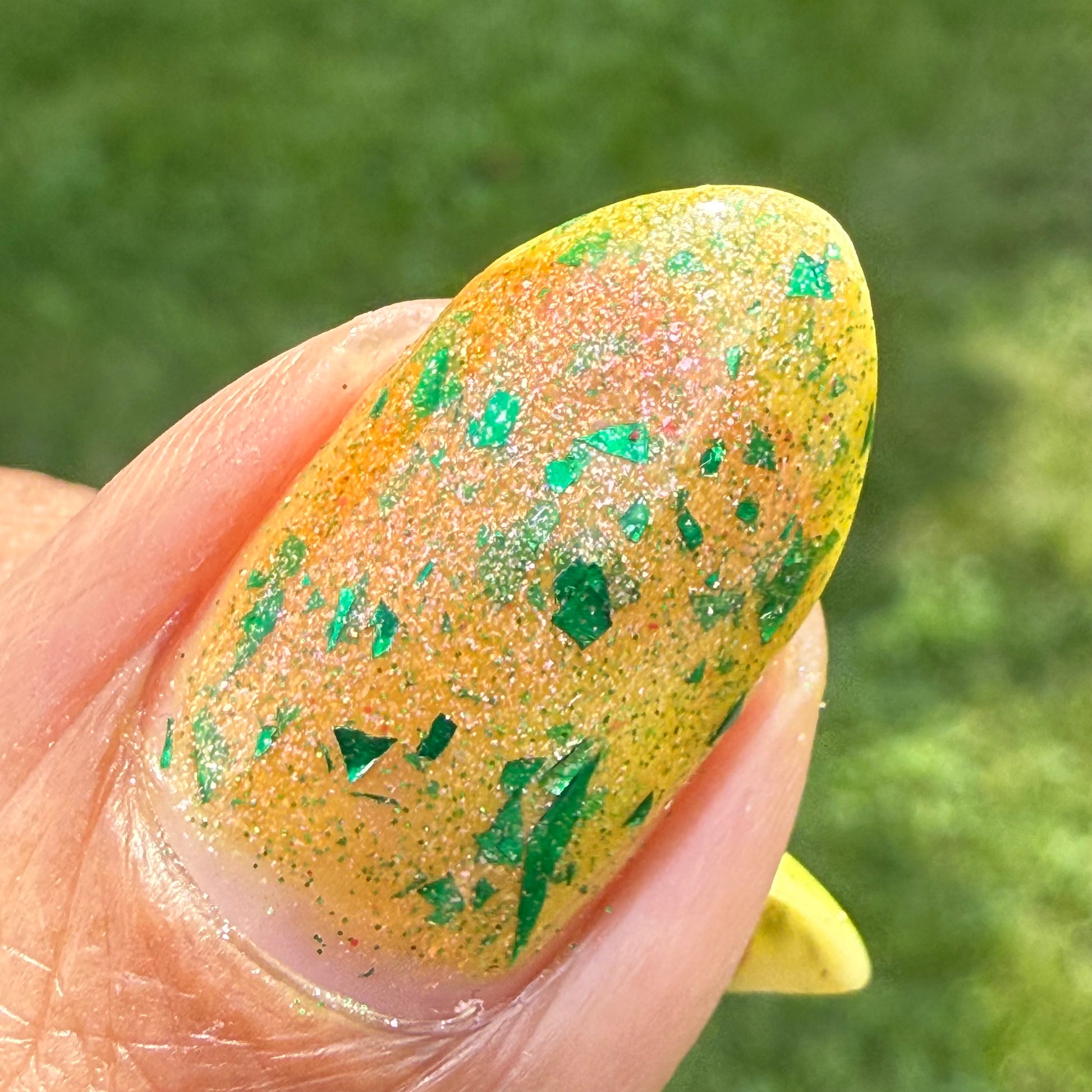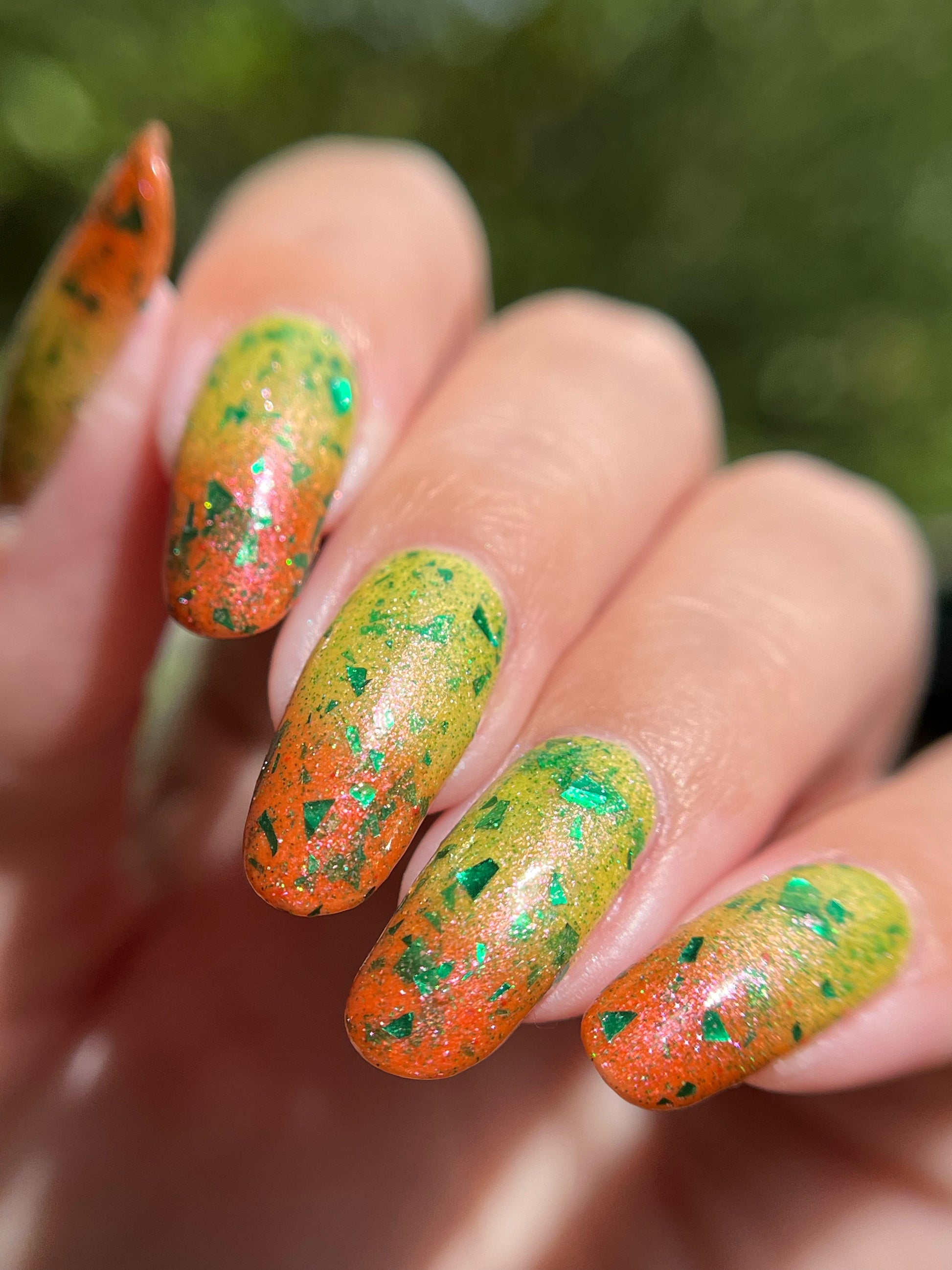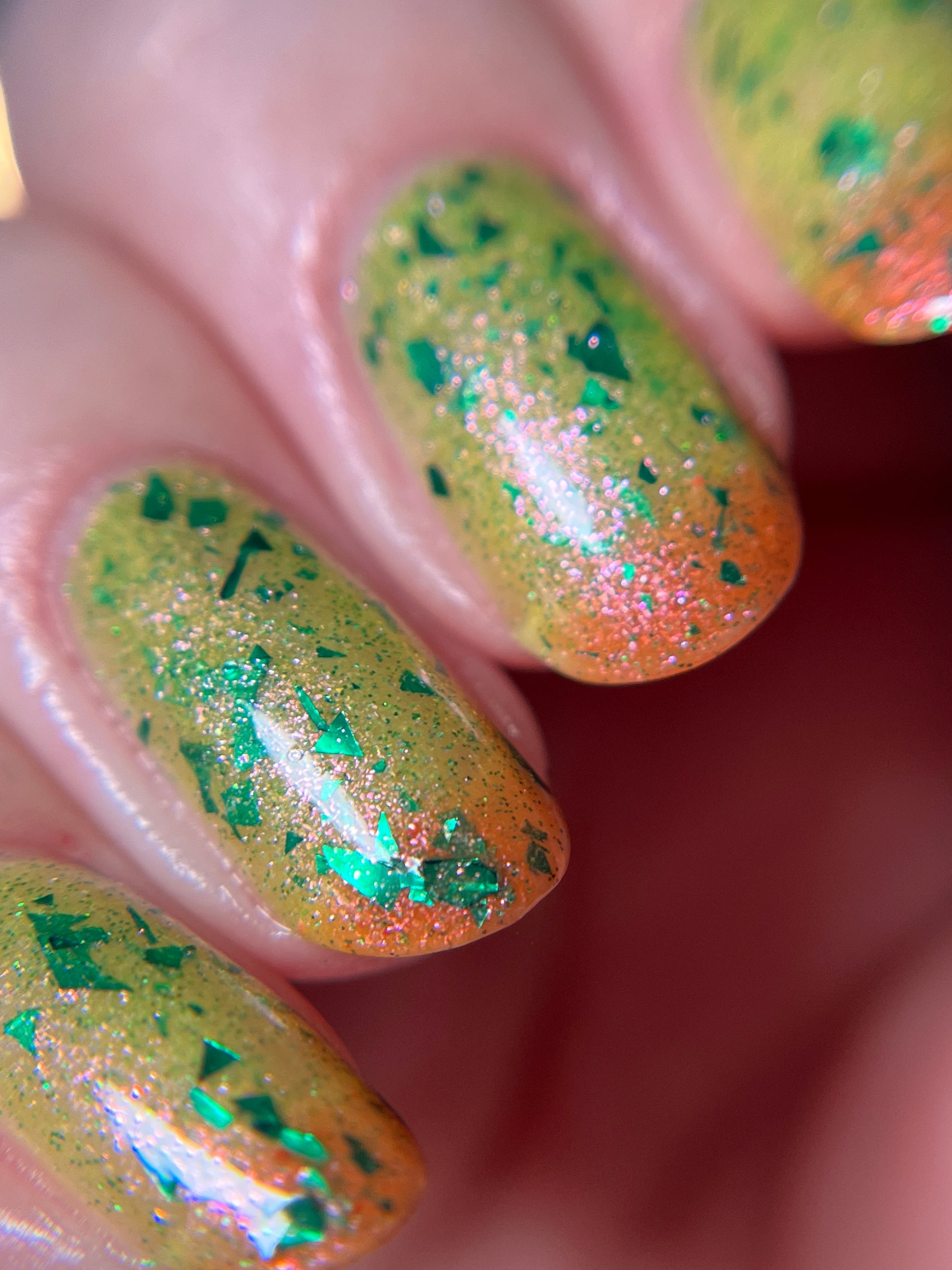 Let It Ripen! is described as a shimmery thermal polish (orange when cold & yellow when warm) with green glitter and flakes. This polish is Limited Edition and will only be sold until we run out of the thermal pigment used, which we can no longer buy.