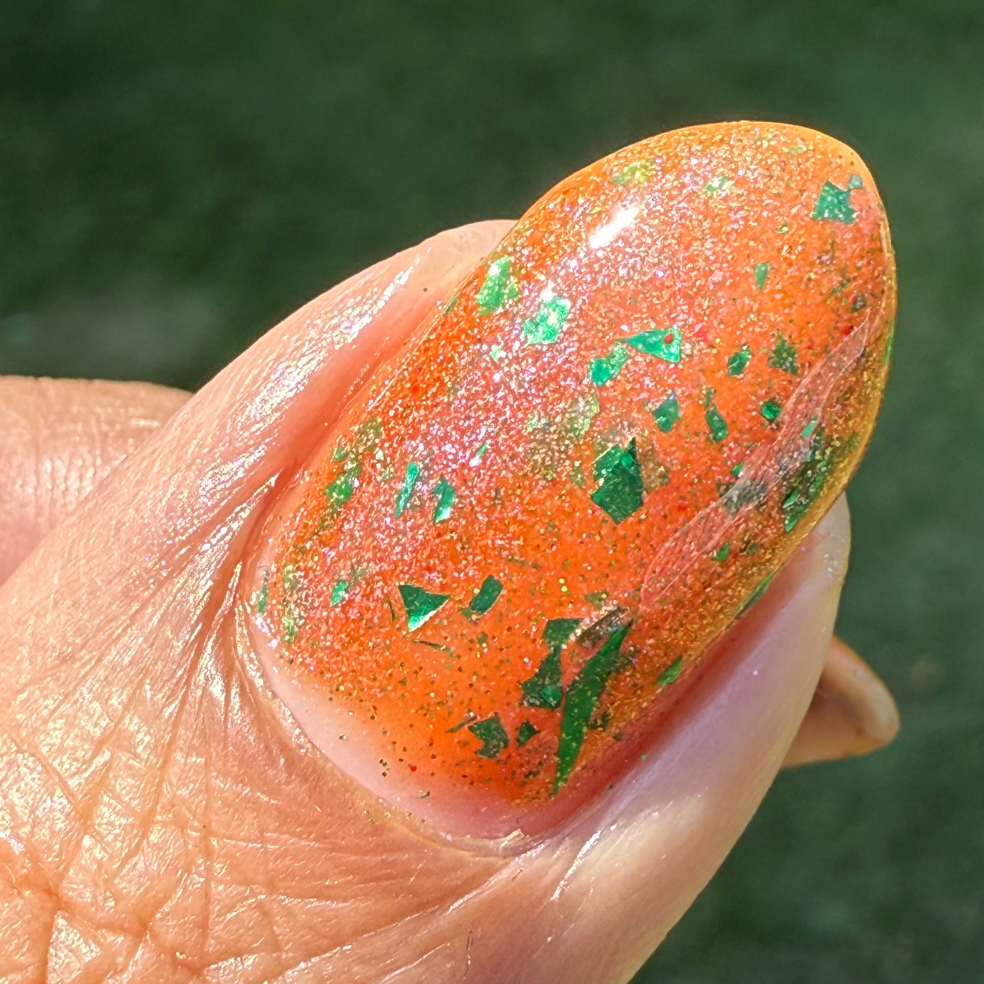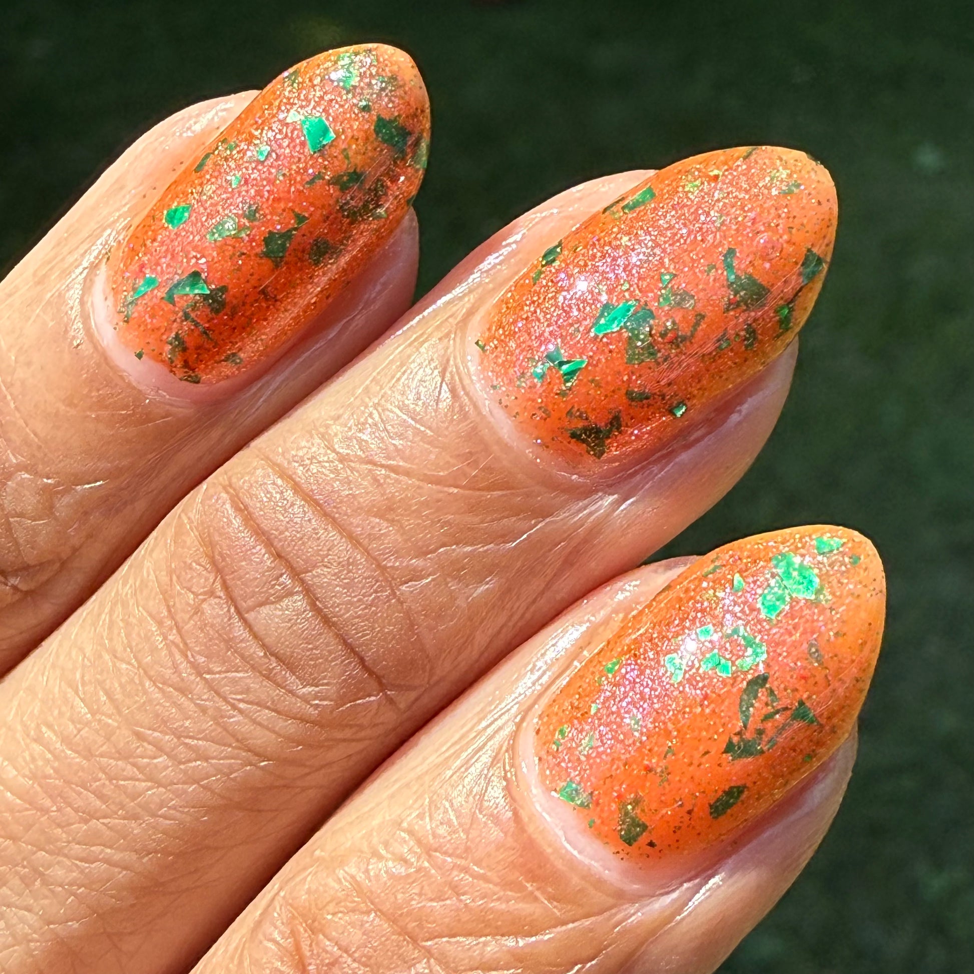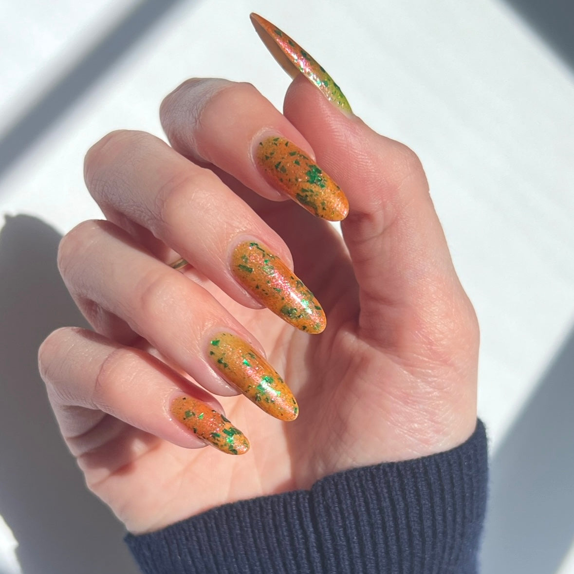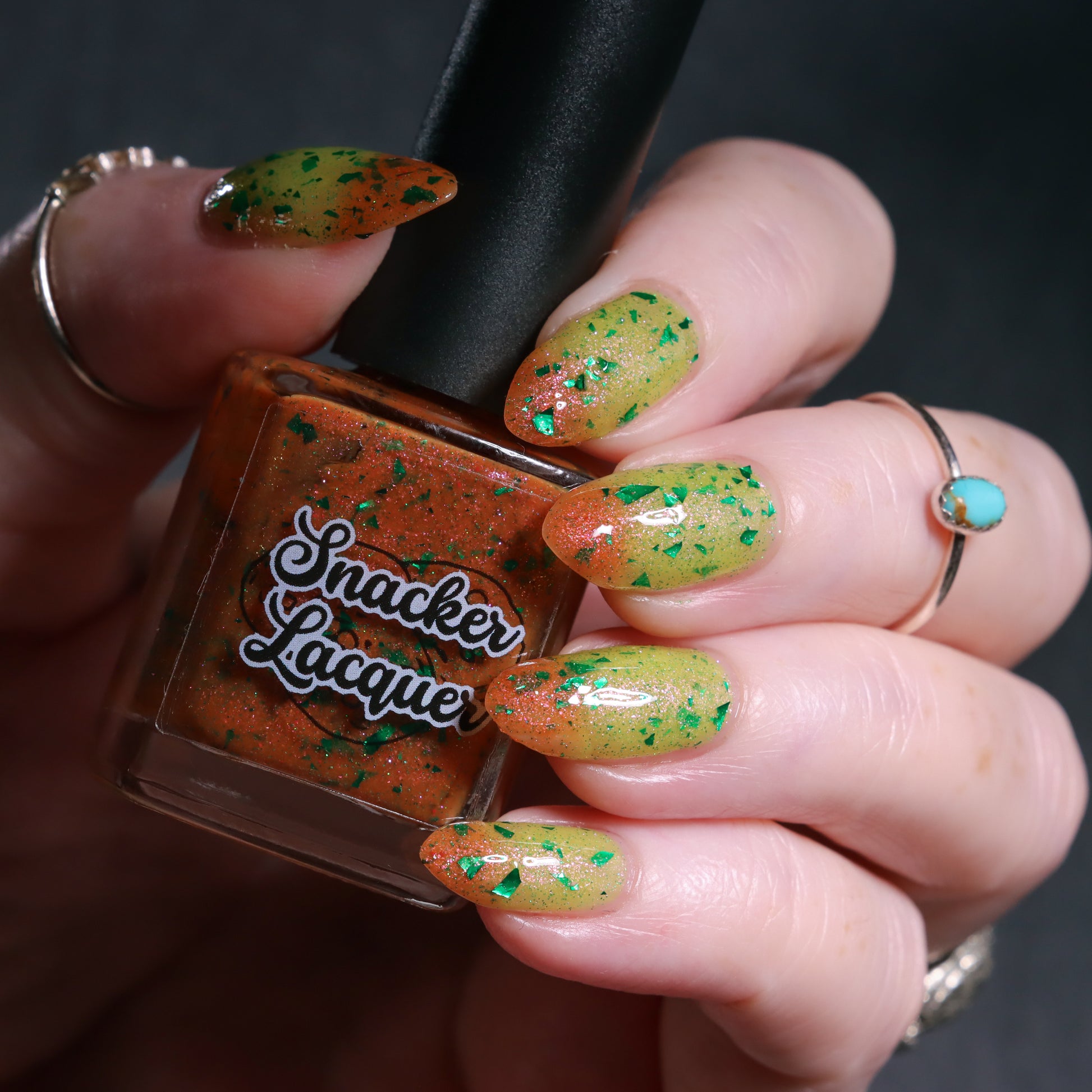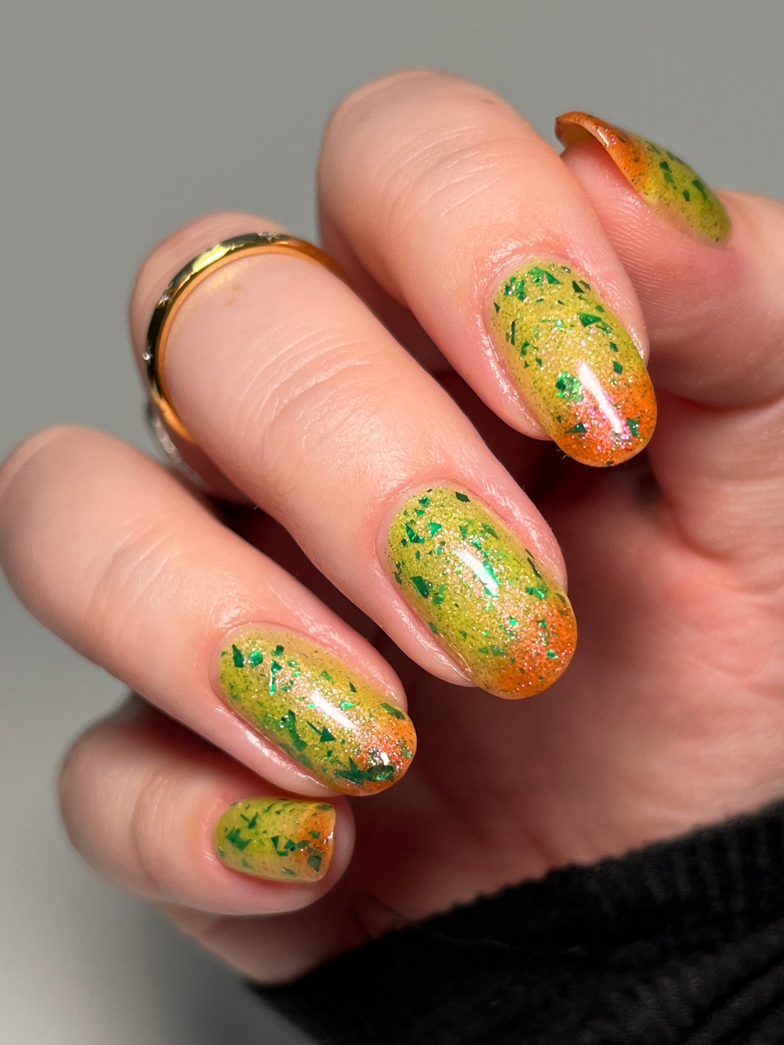 Let It Ripen! is described as a shimmery thermal polish (orange when cold & yellow when warm) with green glitter and flakes. This polish is Limited Edition and will only be sold until we run out of the thermal pigment used, which we can no longer buy.