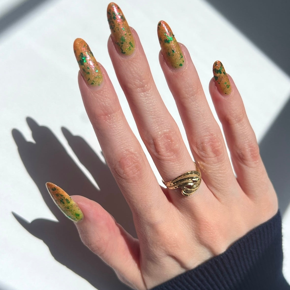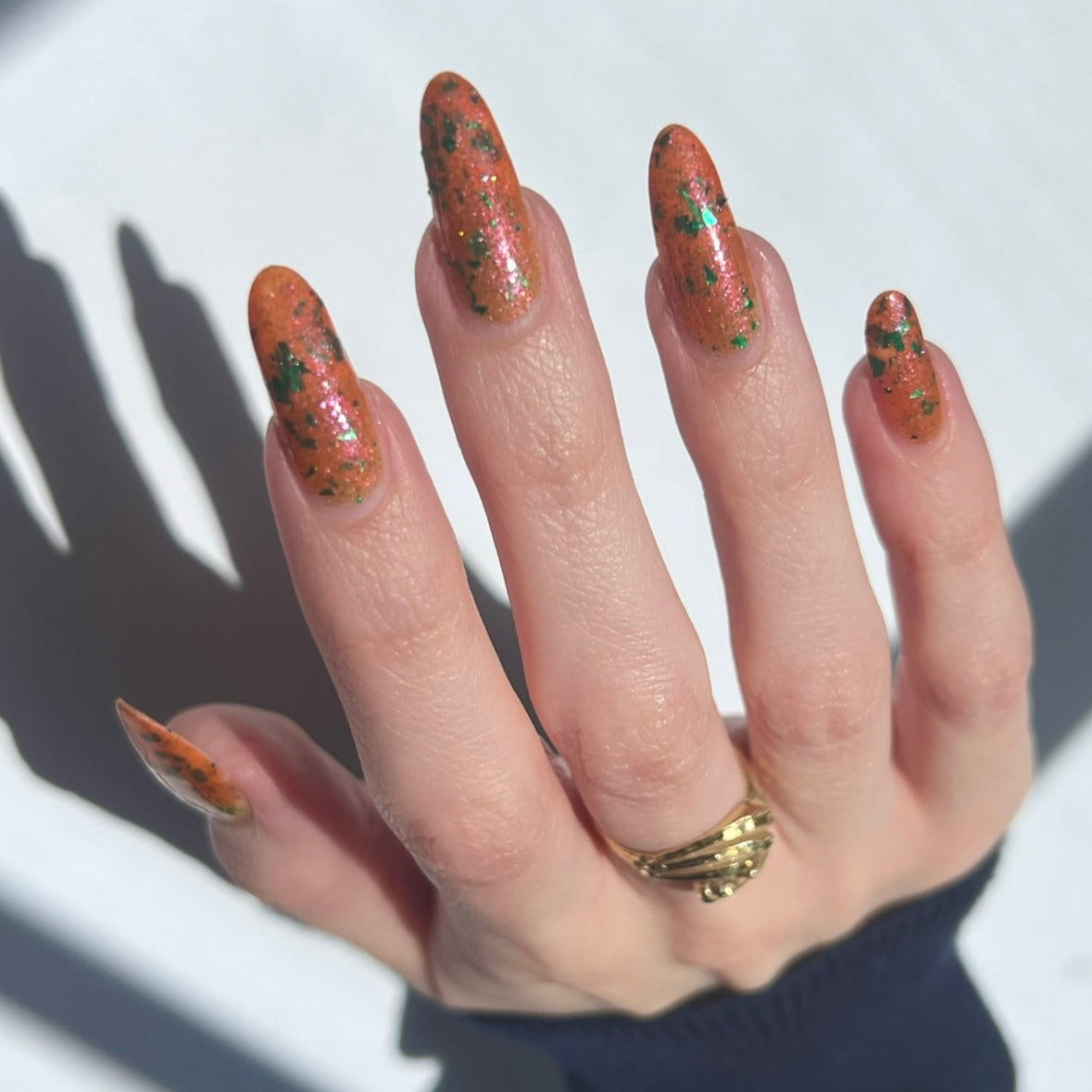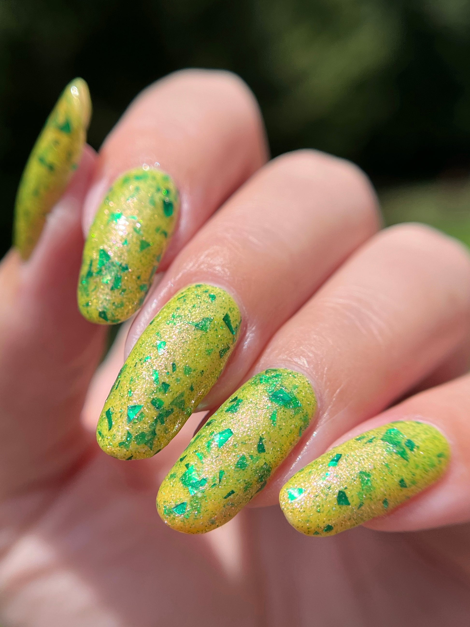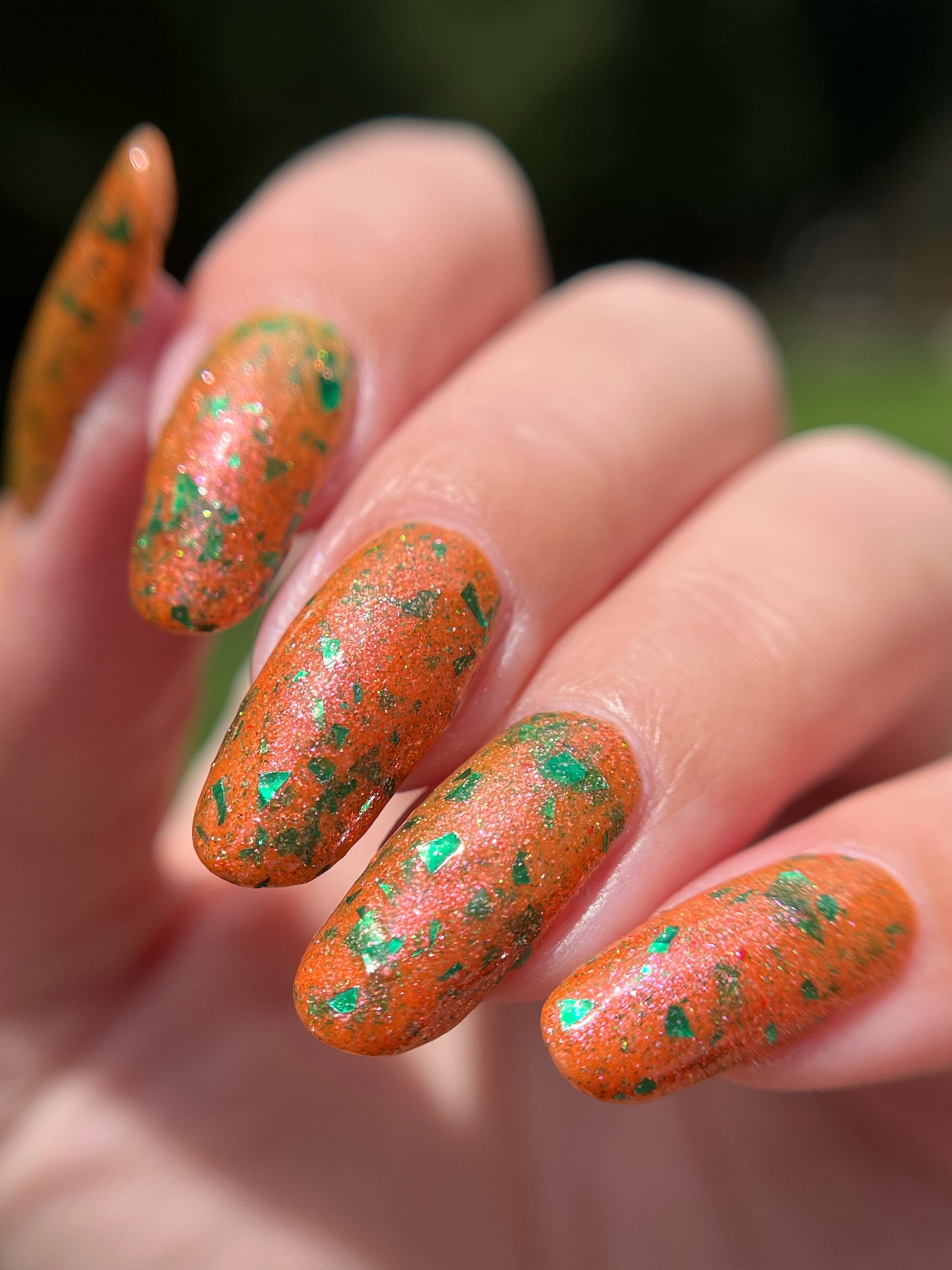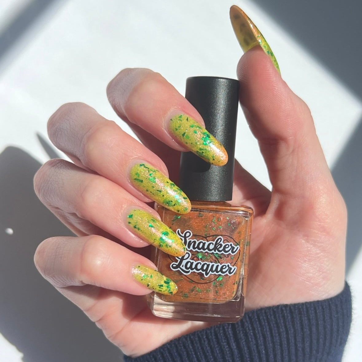 Let It Ripen! is described as a shimmery thermal polish (orange when cold & yellow when warm) with green glitter and flakes. This polish is Limited Edition and will only be sold until we run out of the thermal pigment used, which we can no longer buy.
