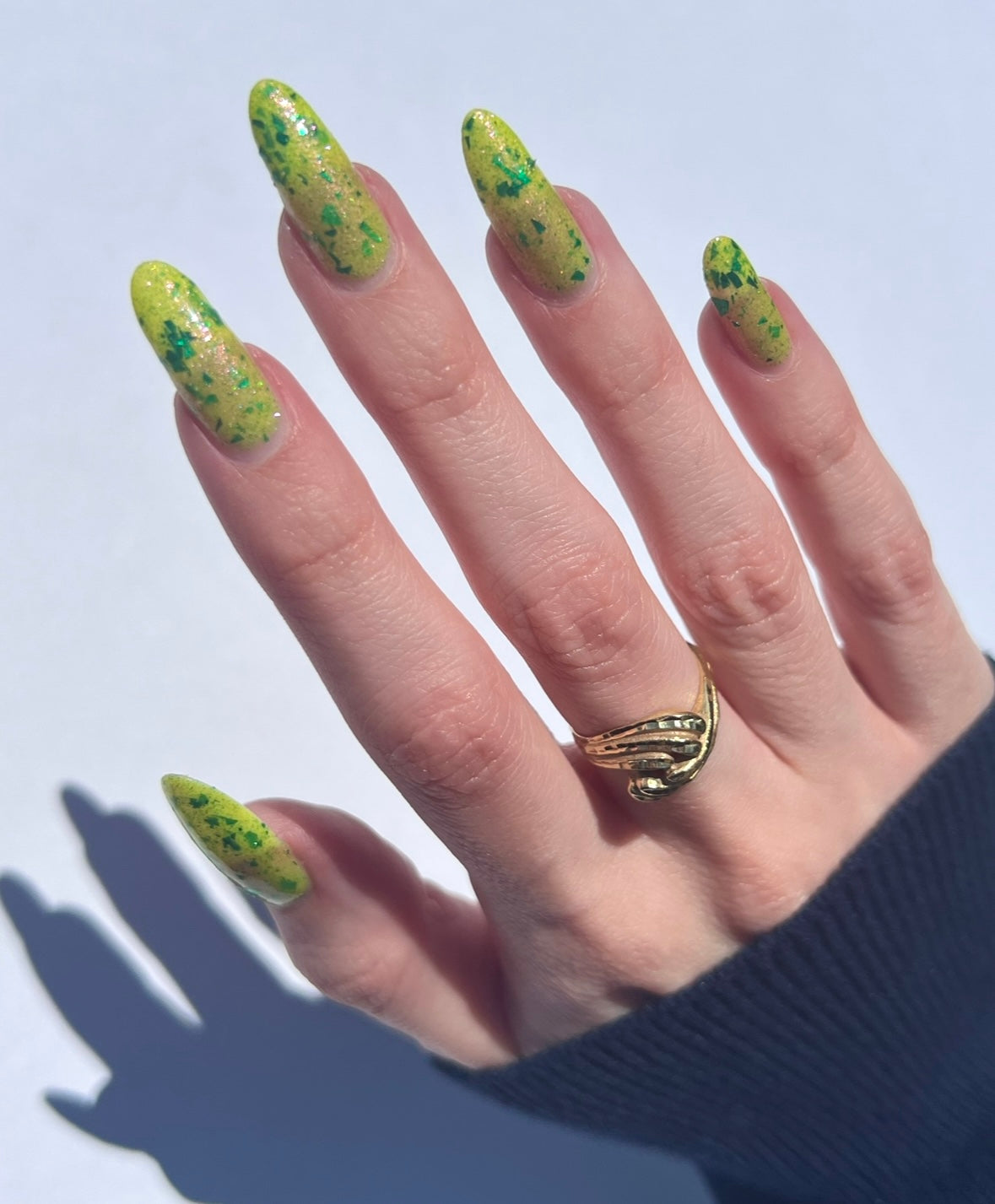 Note: Due to the number of flakes in this polish, some may want to use a glitter-smoothing topcoat along with a glossy topcoat. There is a chance there will be some unmixed pigment in your bottle; this will not affect the polish or your process of painting in any way.