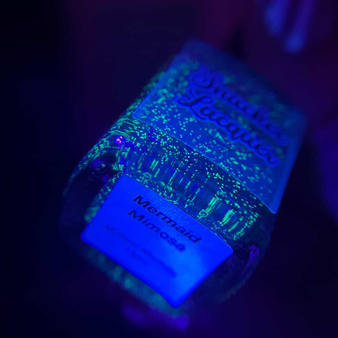 Description: A turquoise treasure from the ocean’s depths, infused with glowing glitter and iridescent flakes that shifting like a mermaid's tail. There in reflective glitter in this polish, which also glows under a UV light. (Limited Edition)