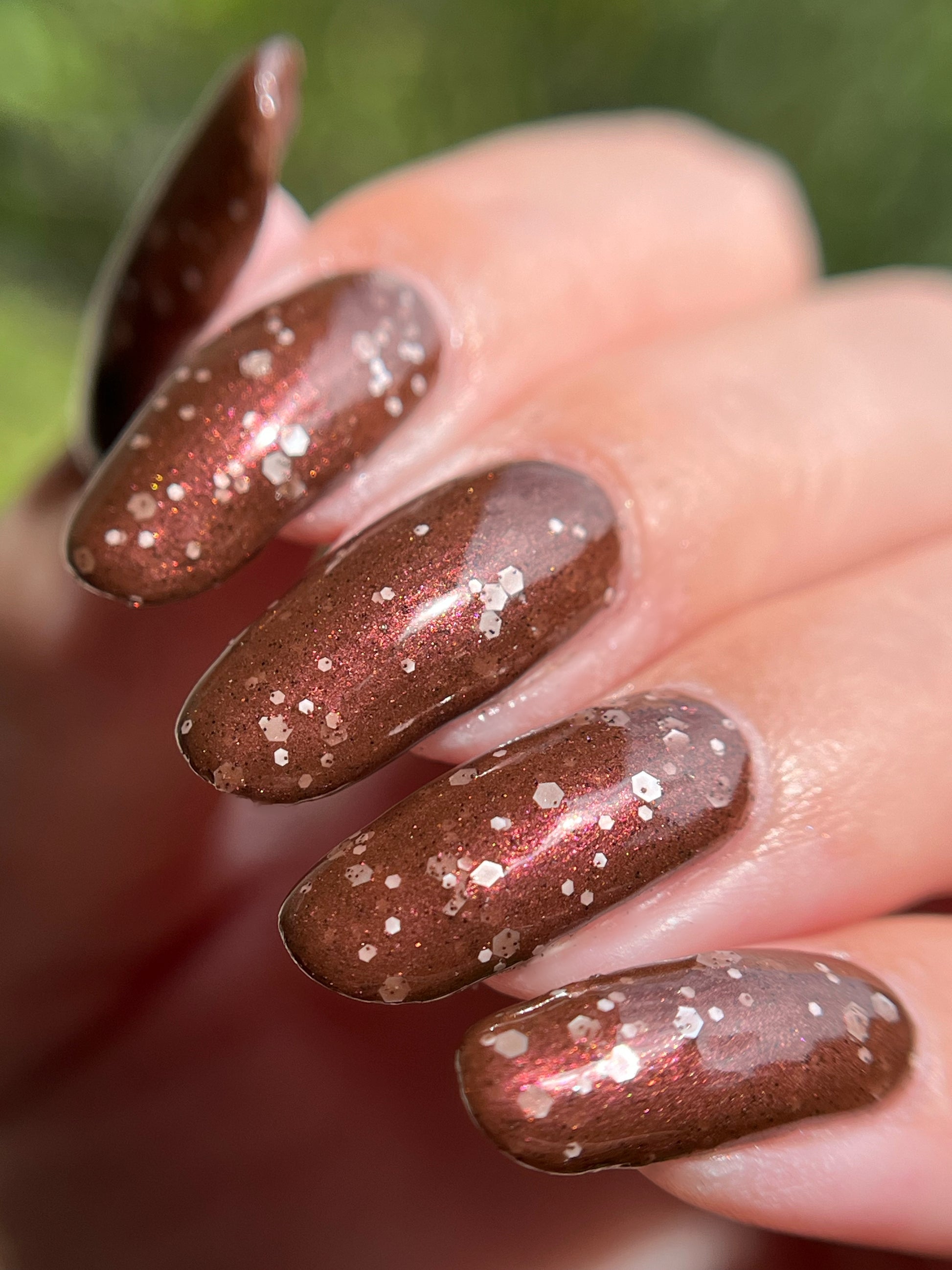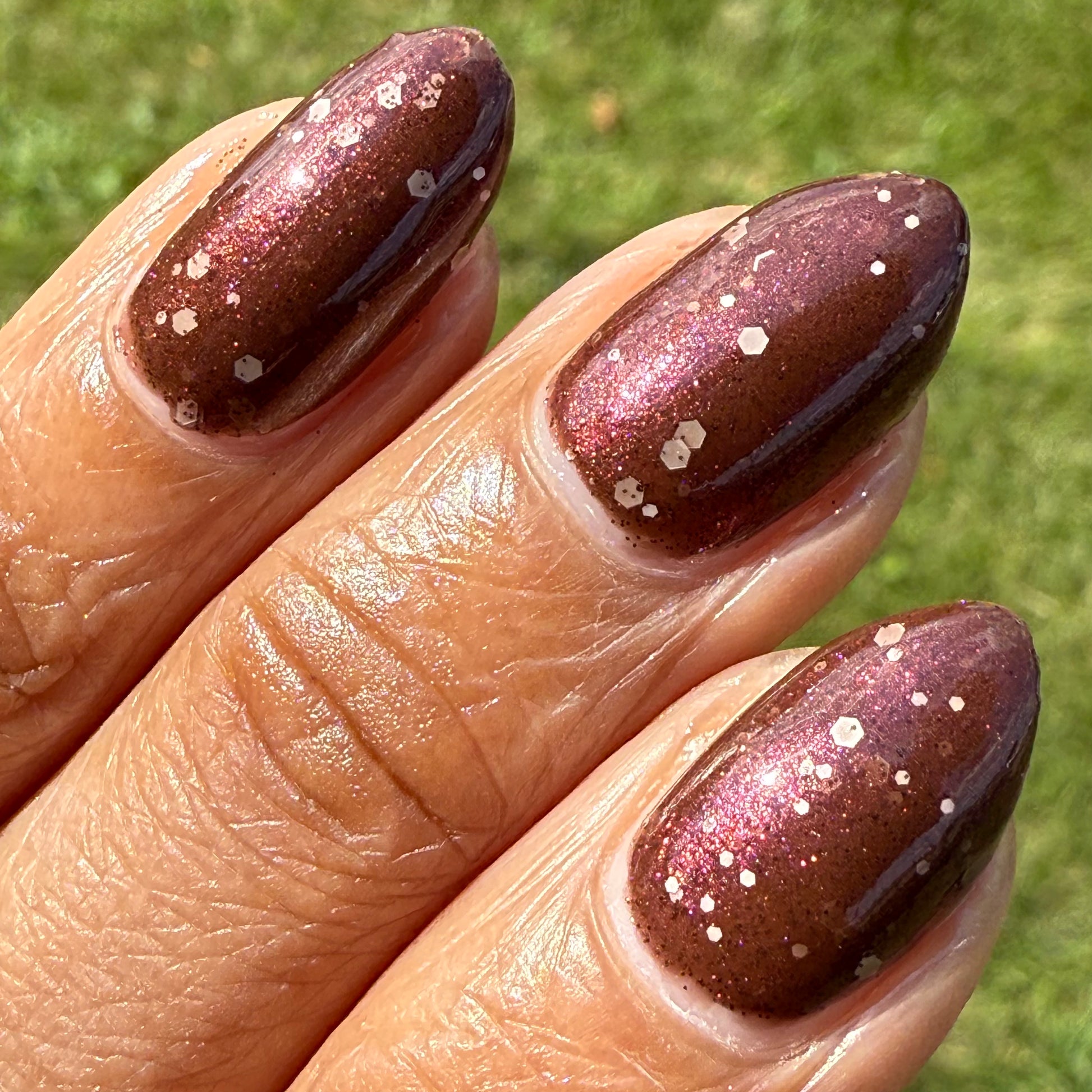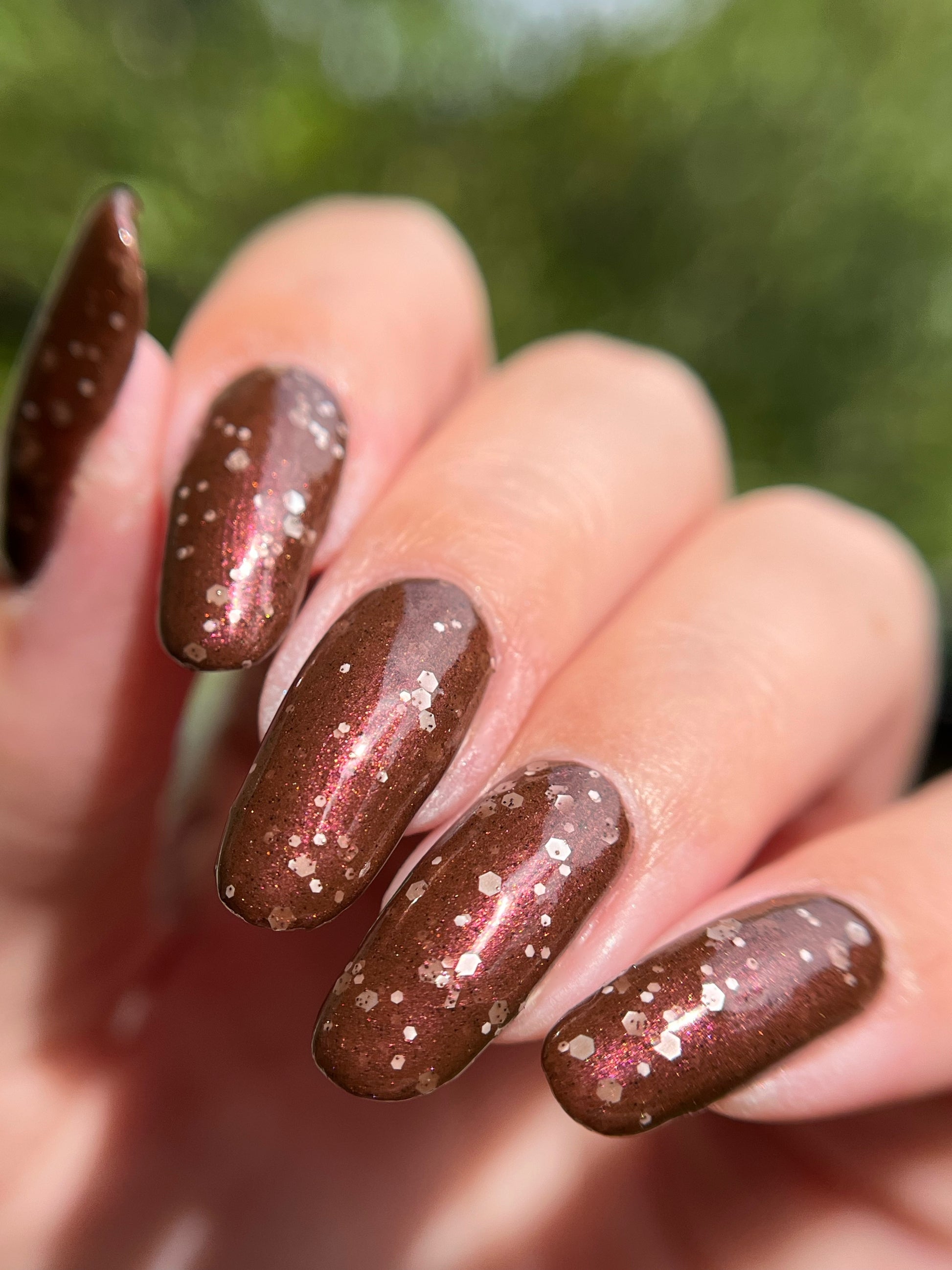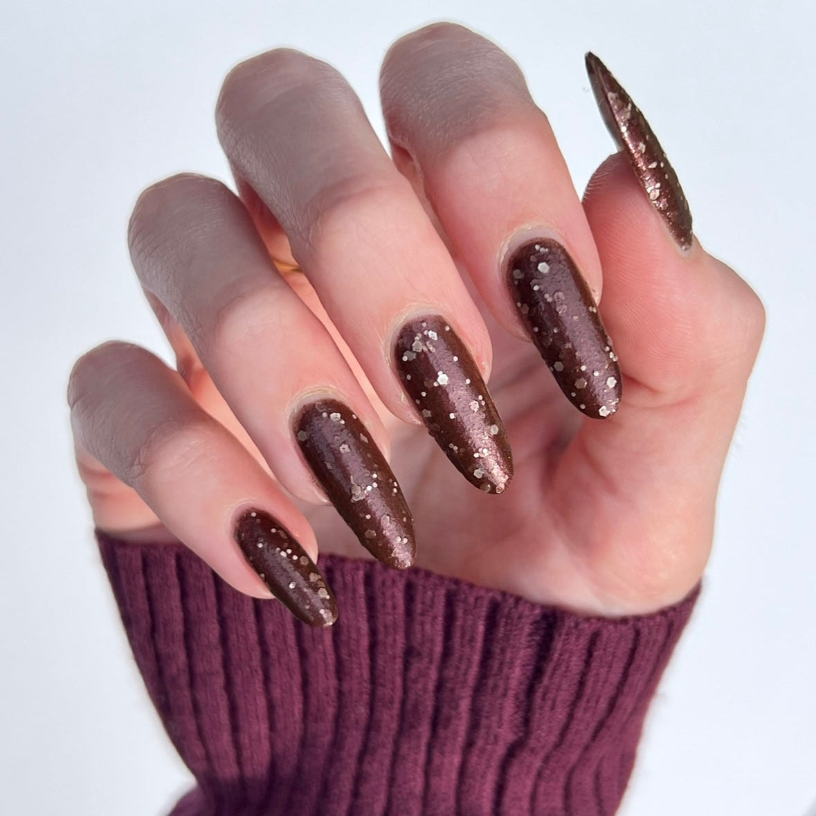 No Duds, Only Spuds is described as a brown polish with red shimmer and various sizes of white matte glitter.