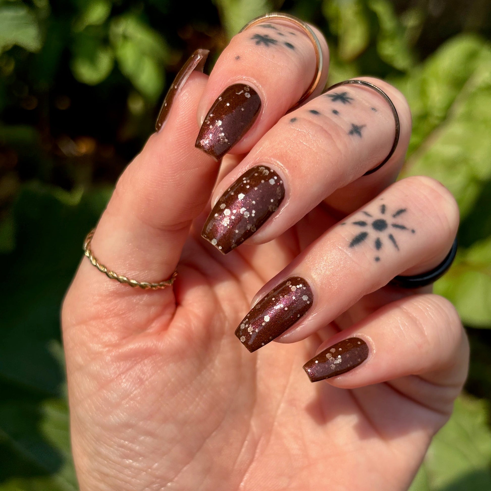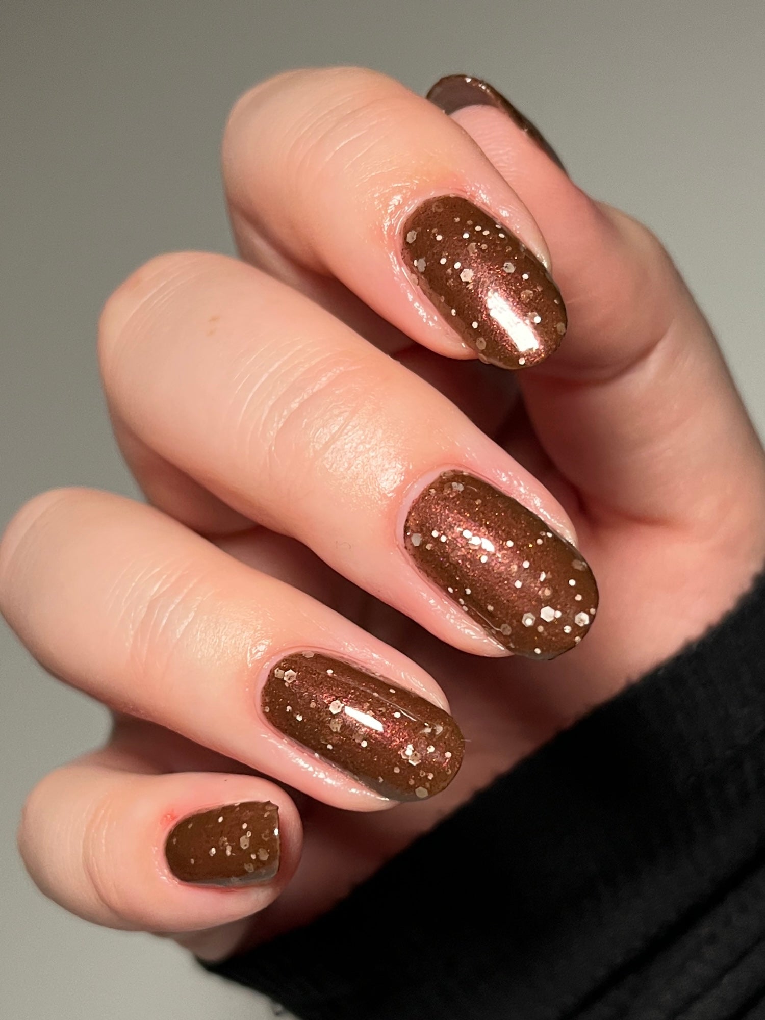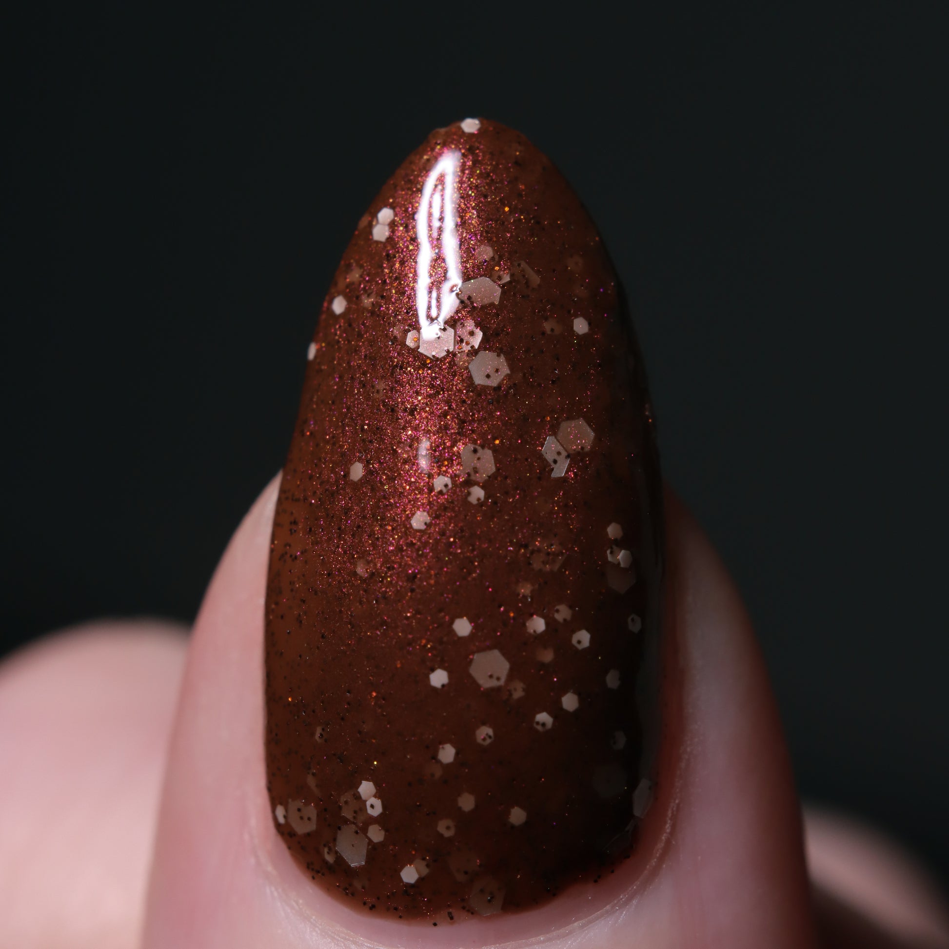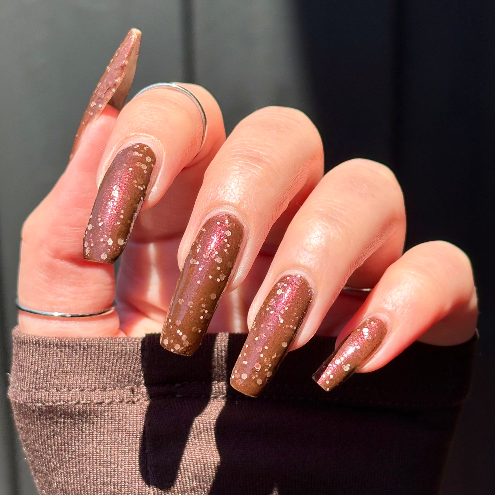 No Duds, Only Spuds is described as a brown polish with red shimmer and various sizes of white matte glitter.