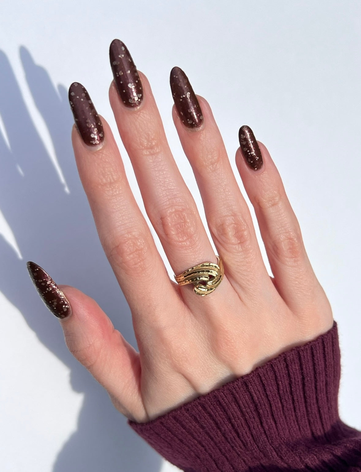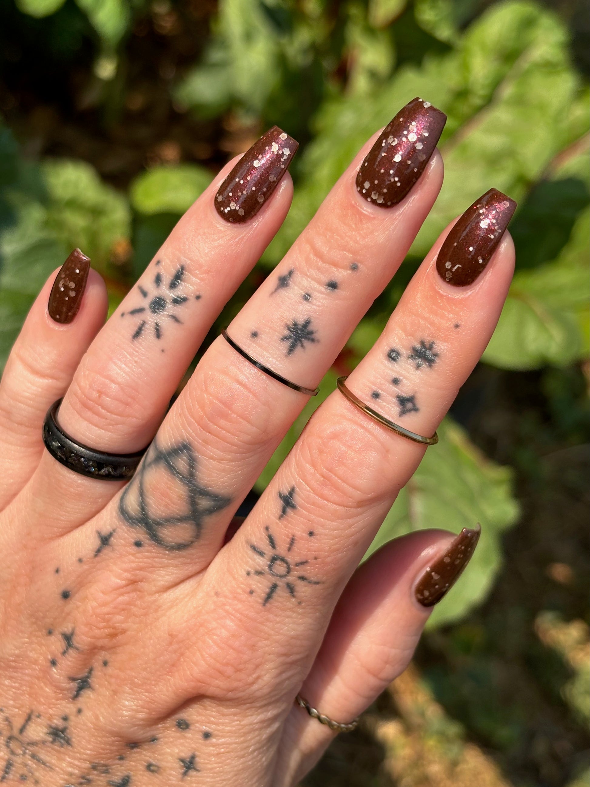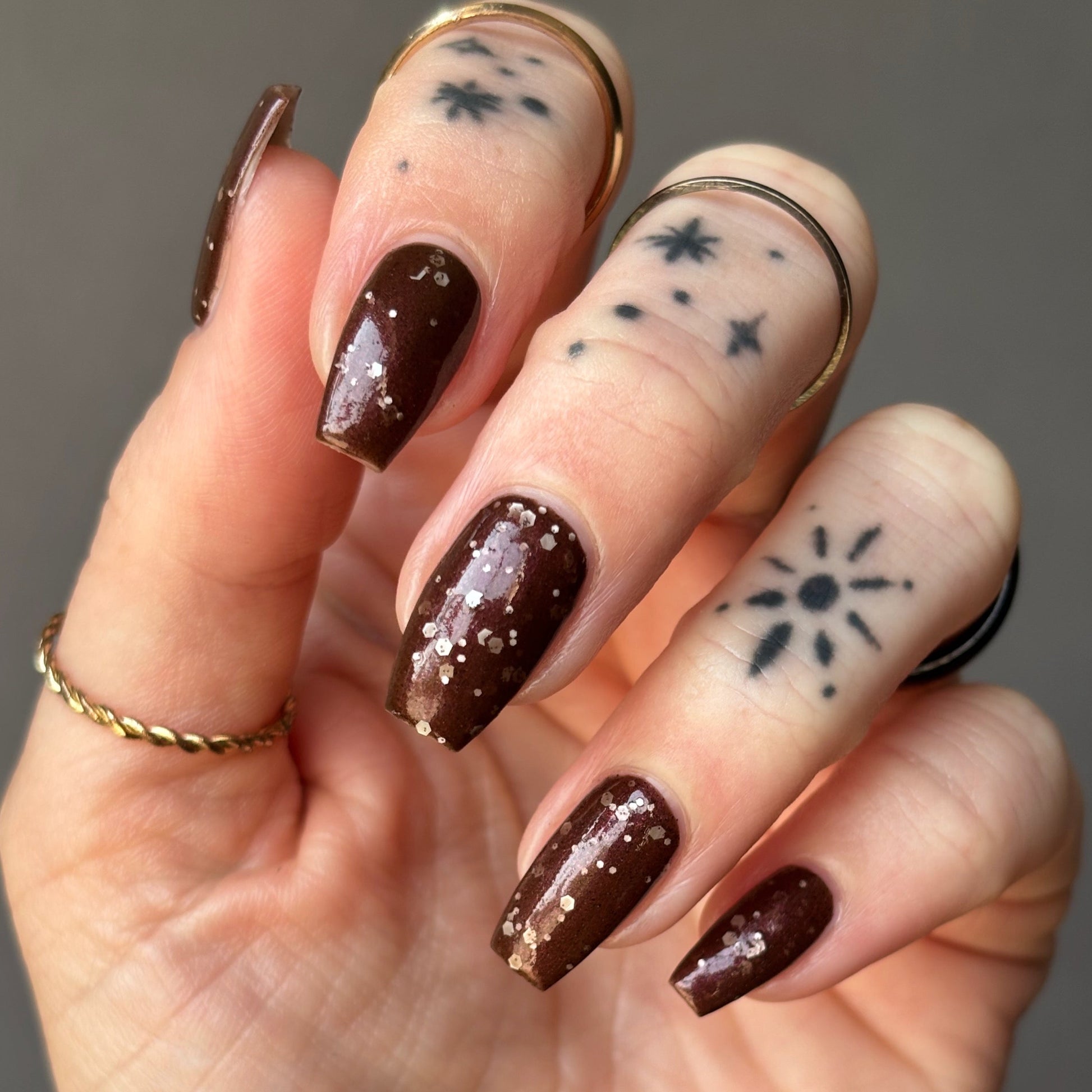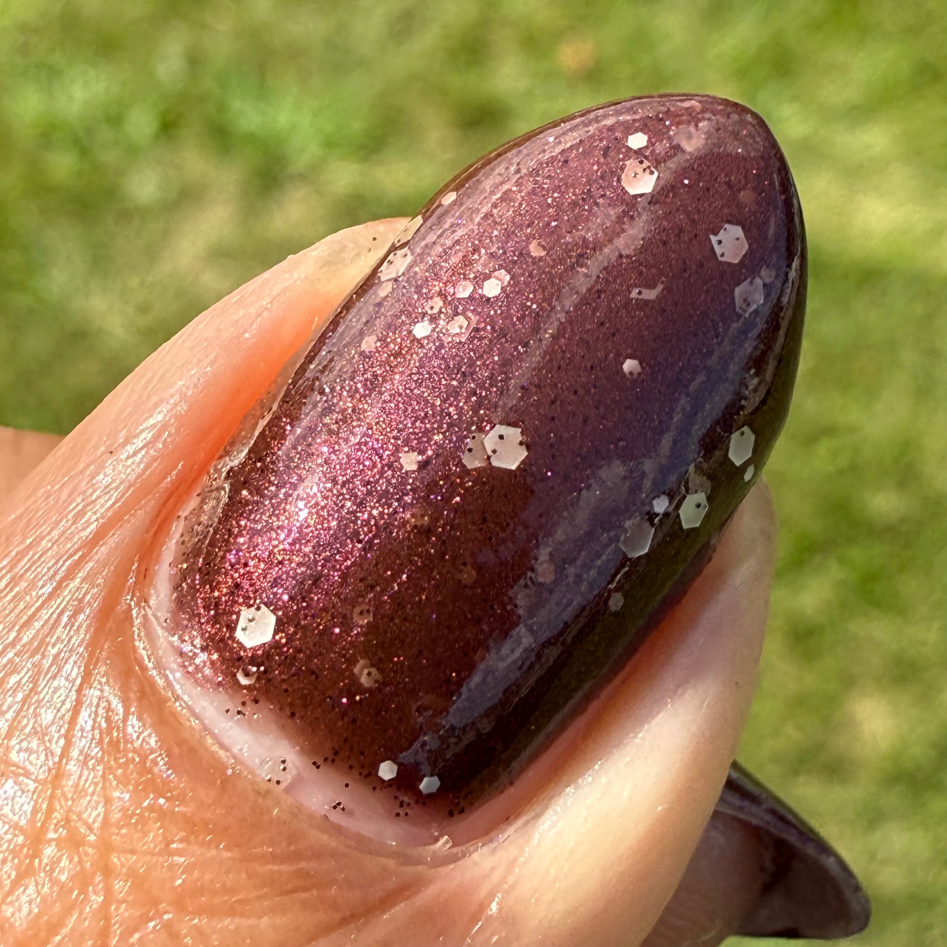 No Duds, Only Spuds is described as a brown polish with red shimmer and various sizes of white matte glitter.