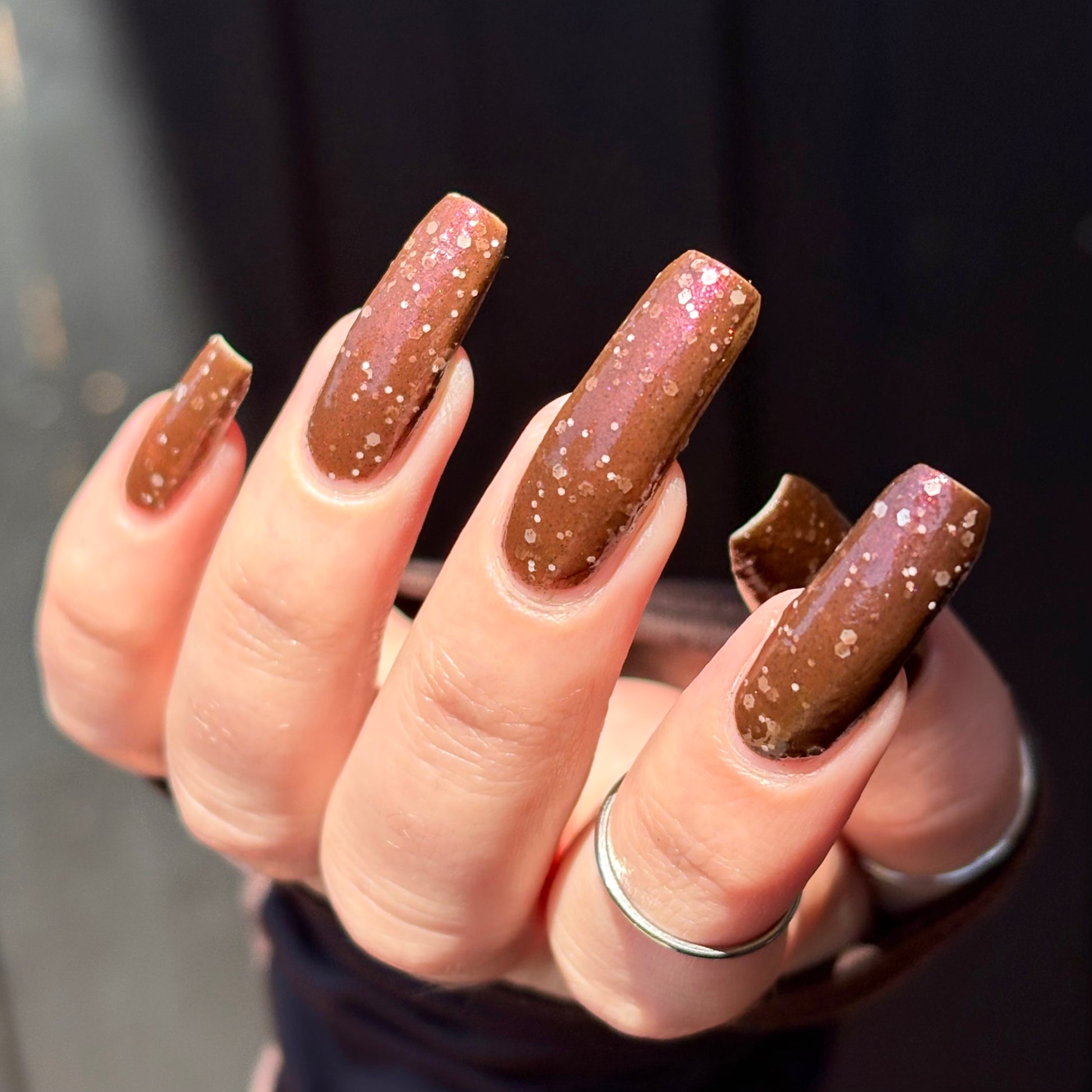 Note: This polish will be difficult to remove due to the various sizes of glitter. We recommend using a glitter smoothing top coat plus a glossy top coat.