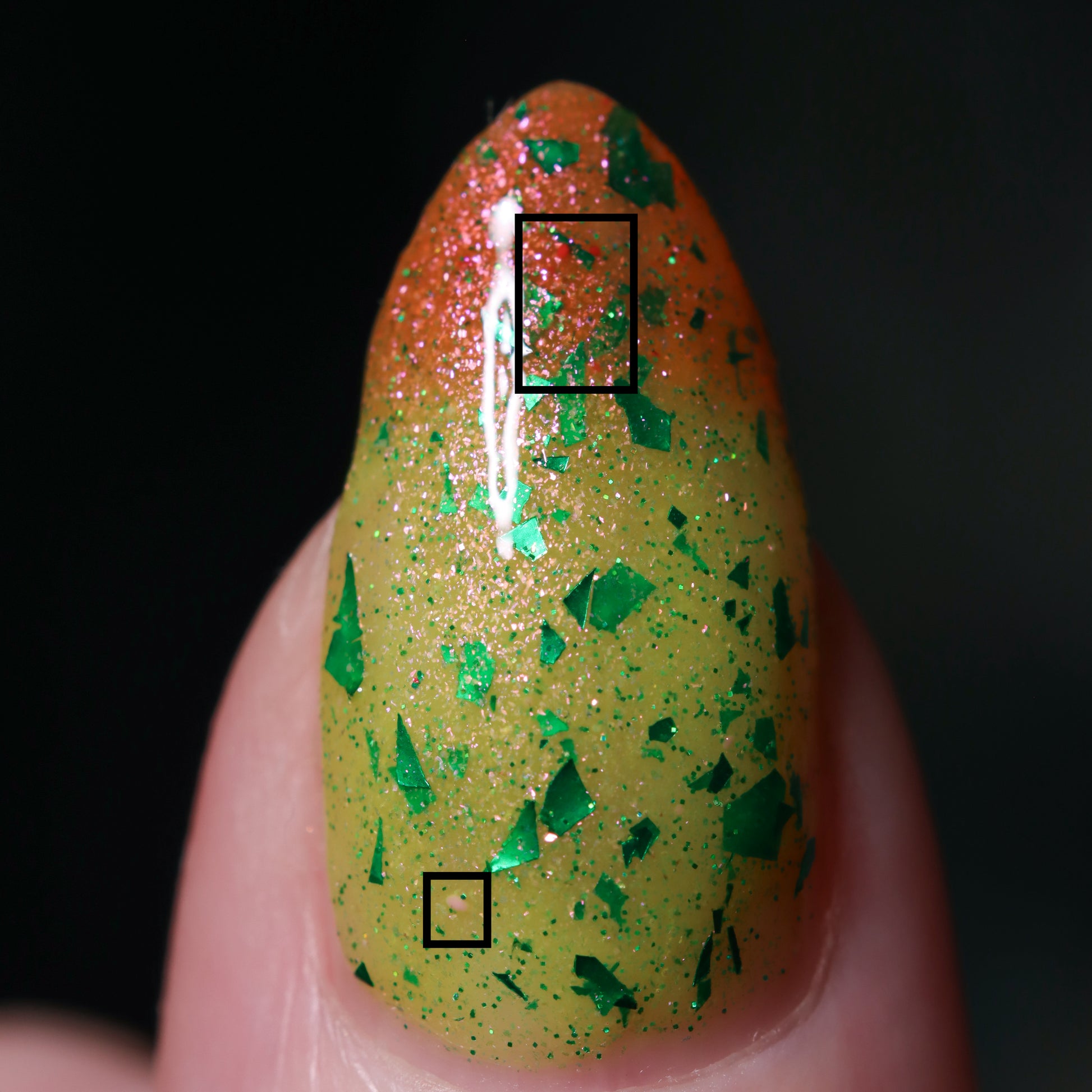 We added a couple boxes around the pigment pieces shown in the macro shots, for reference.