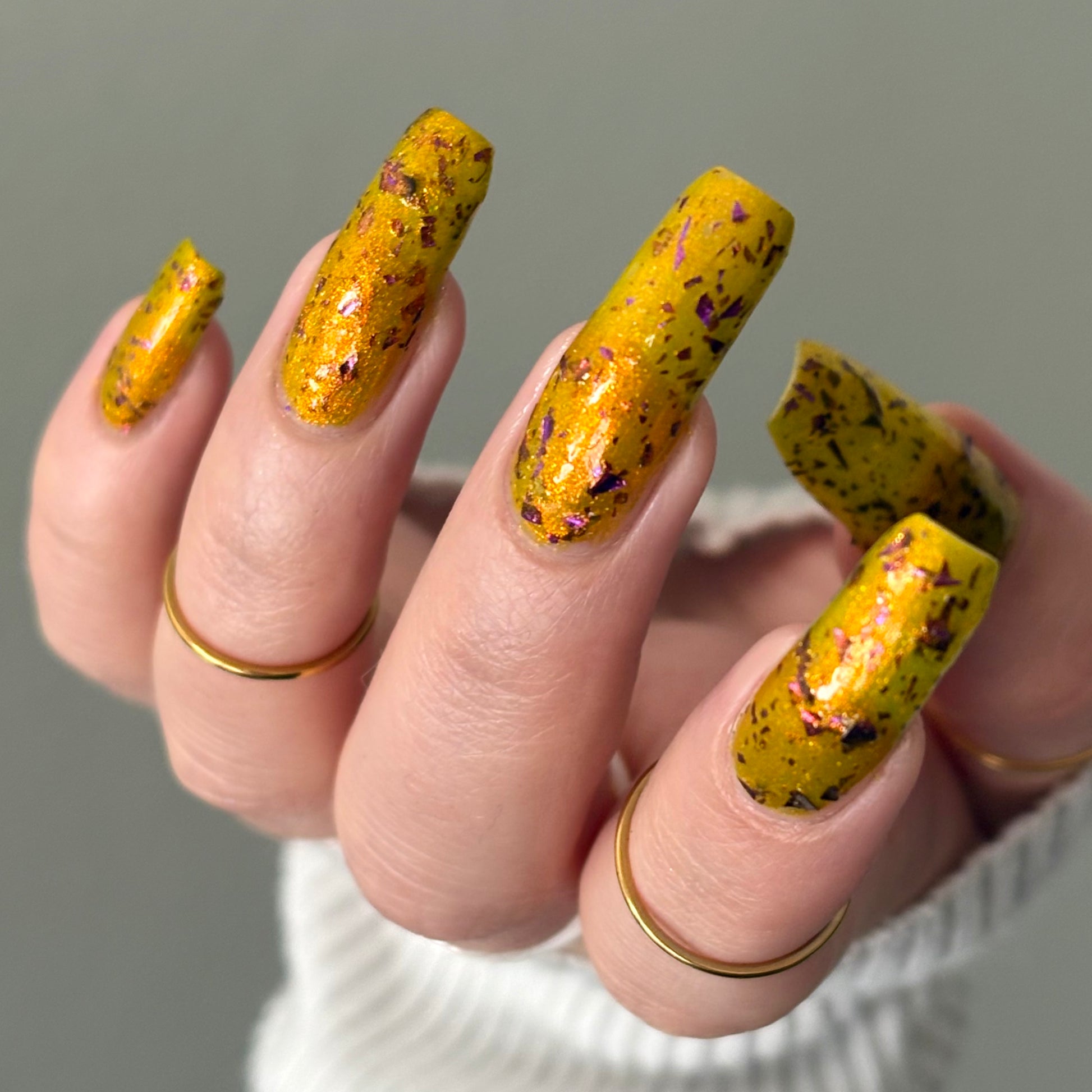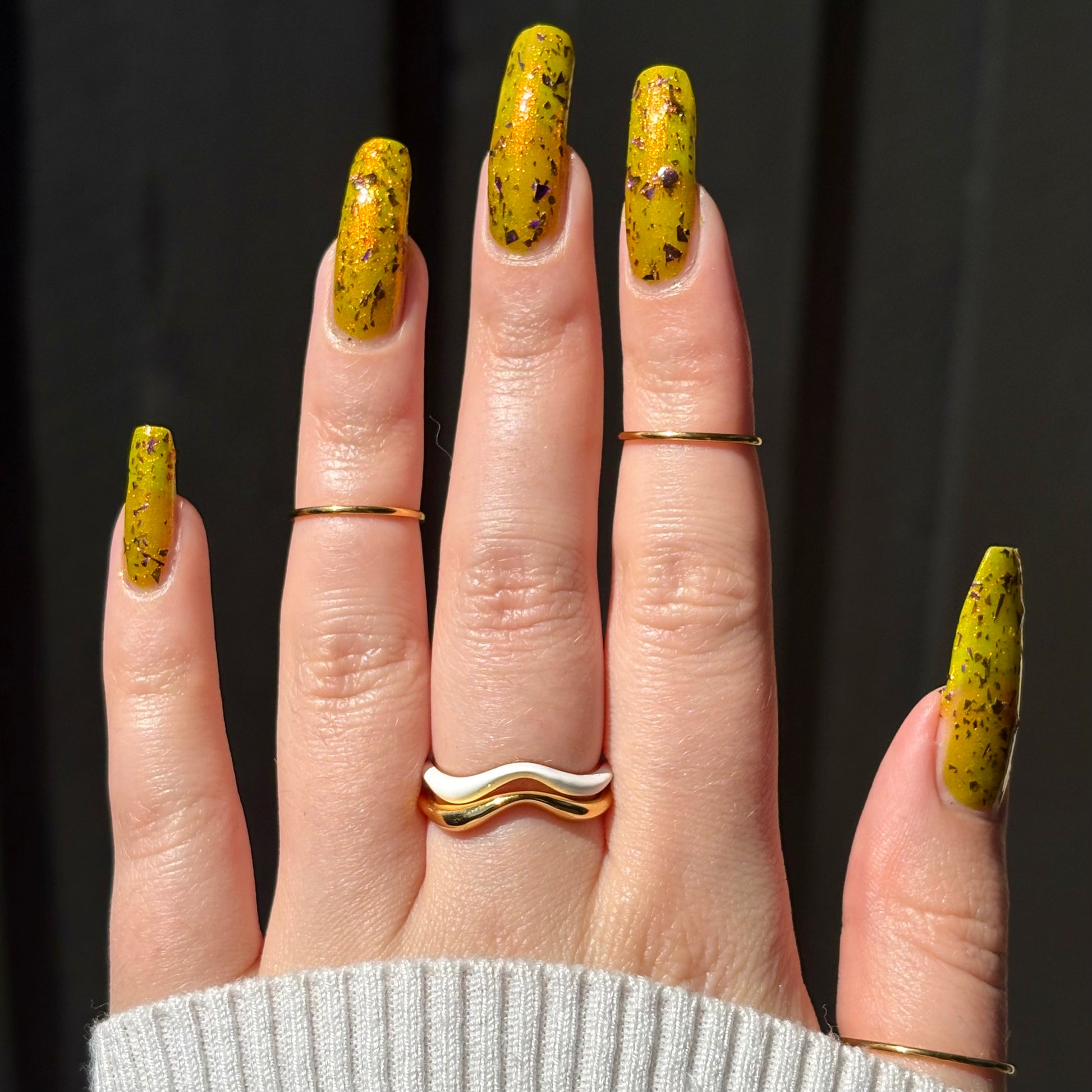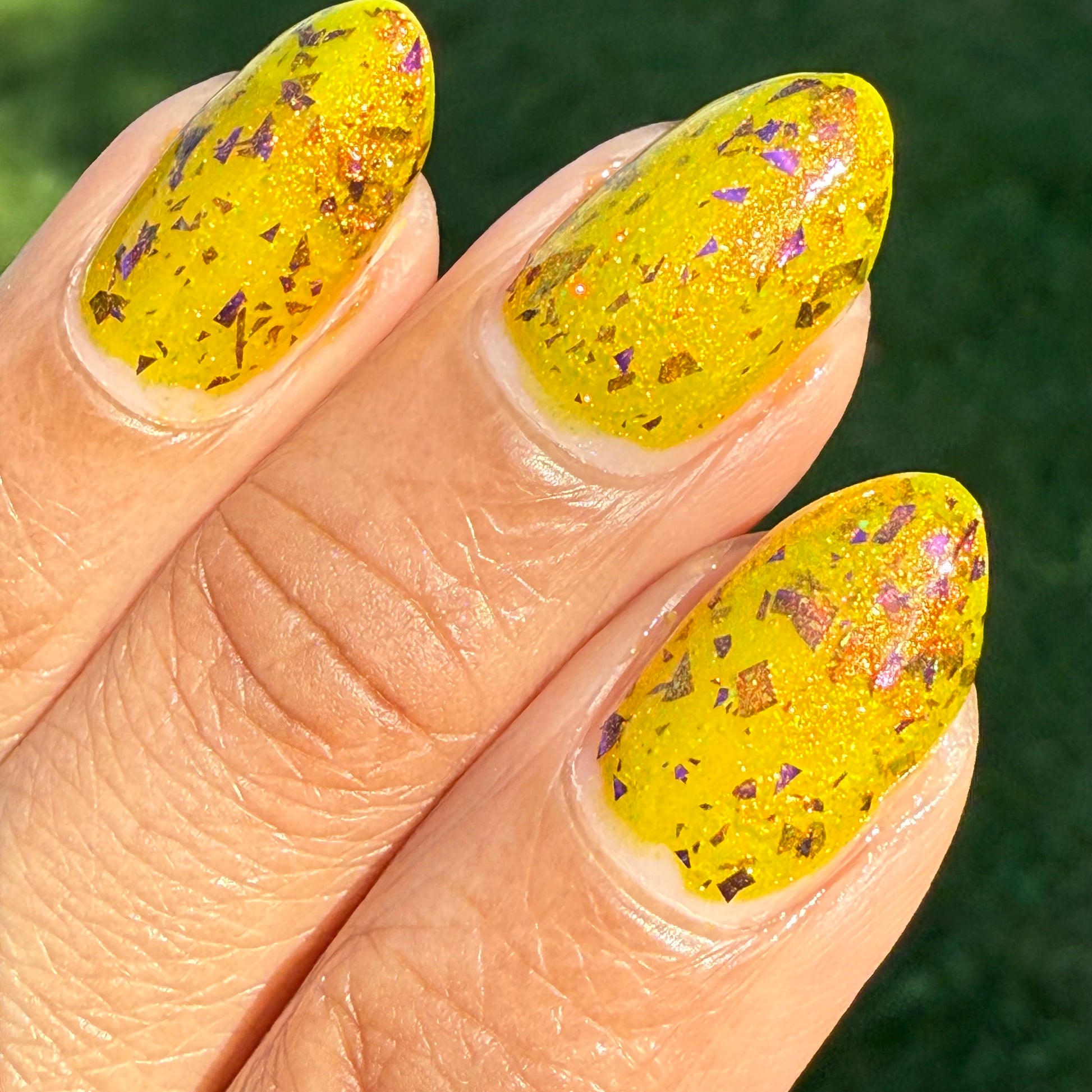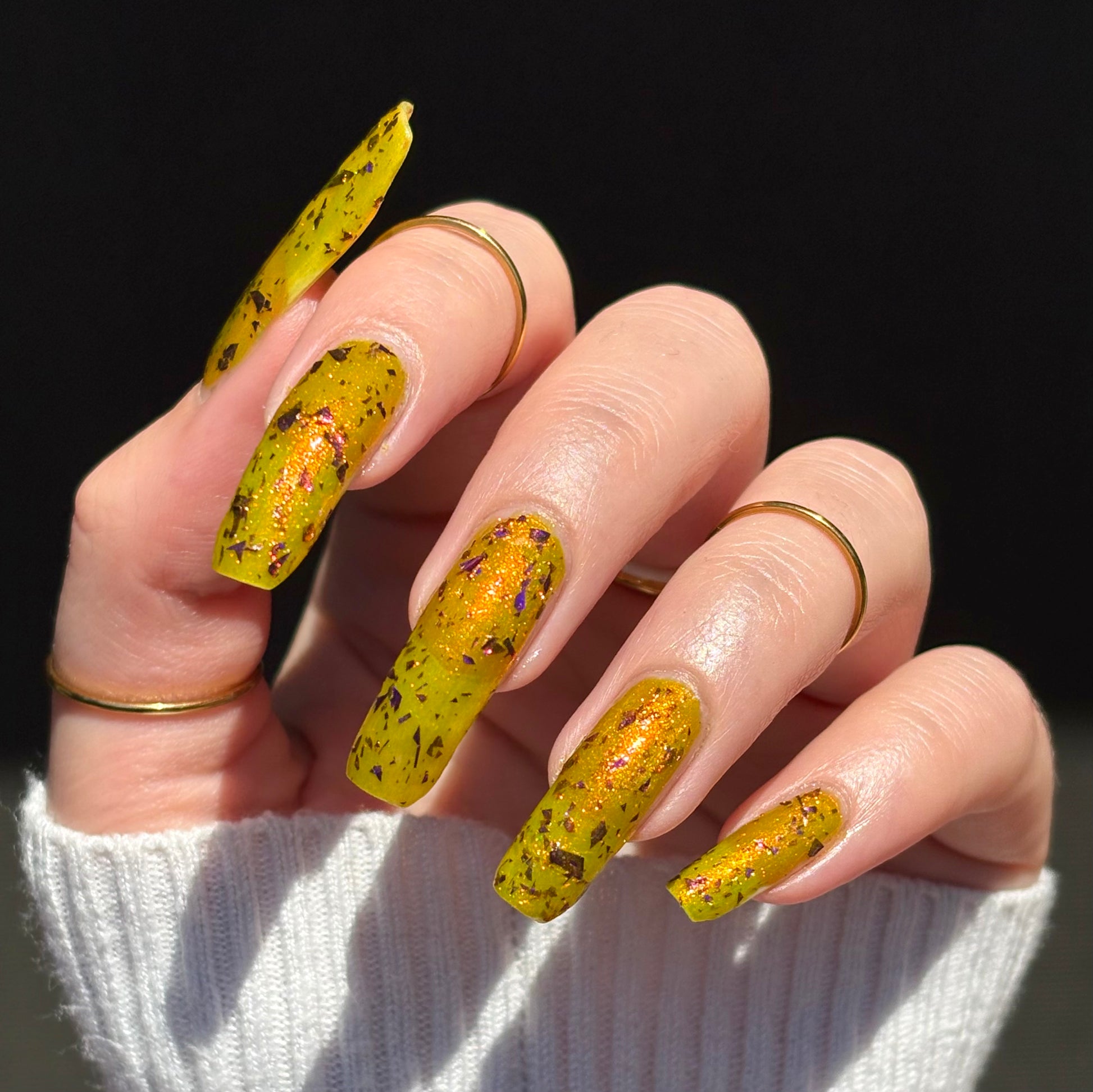 Note: Due to the amount of flakes in this polish, we recommend waiting for your first coat to dry completely before going in with your second coat of polish. Some may want to use a glitter-smoothing topcoat as well to avoid texture from the large flakes.