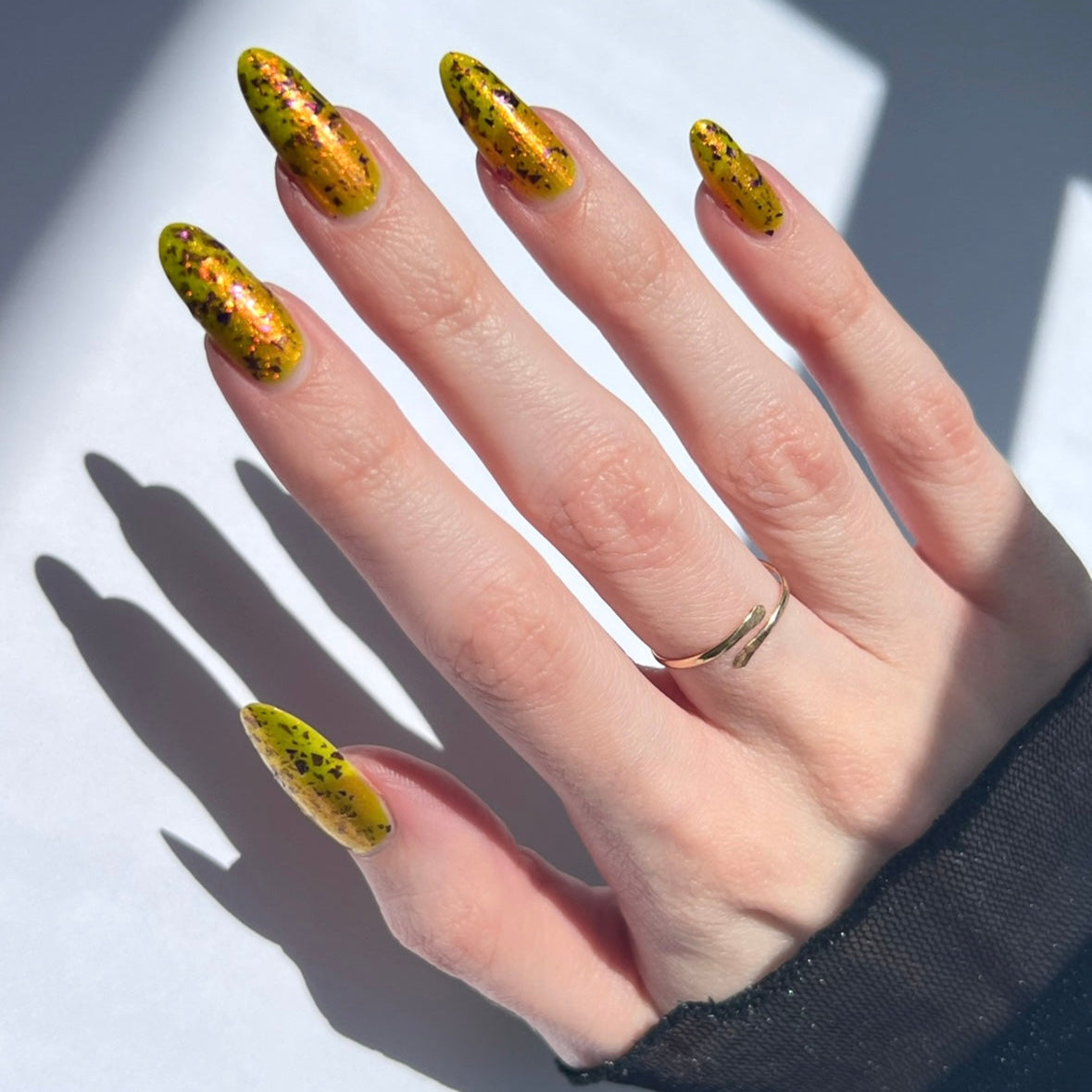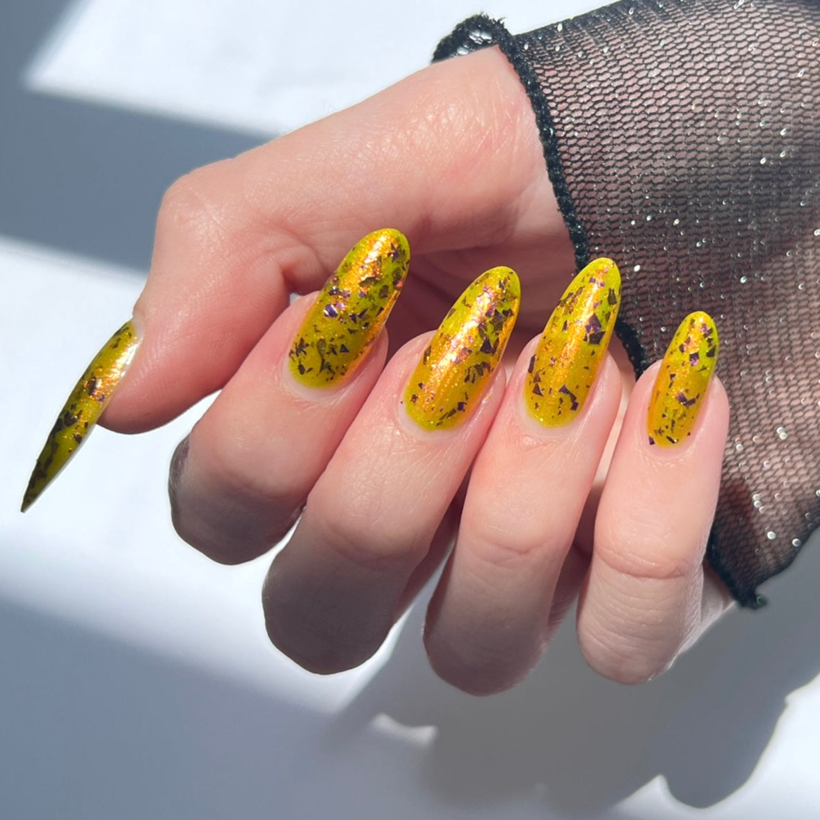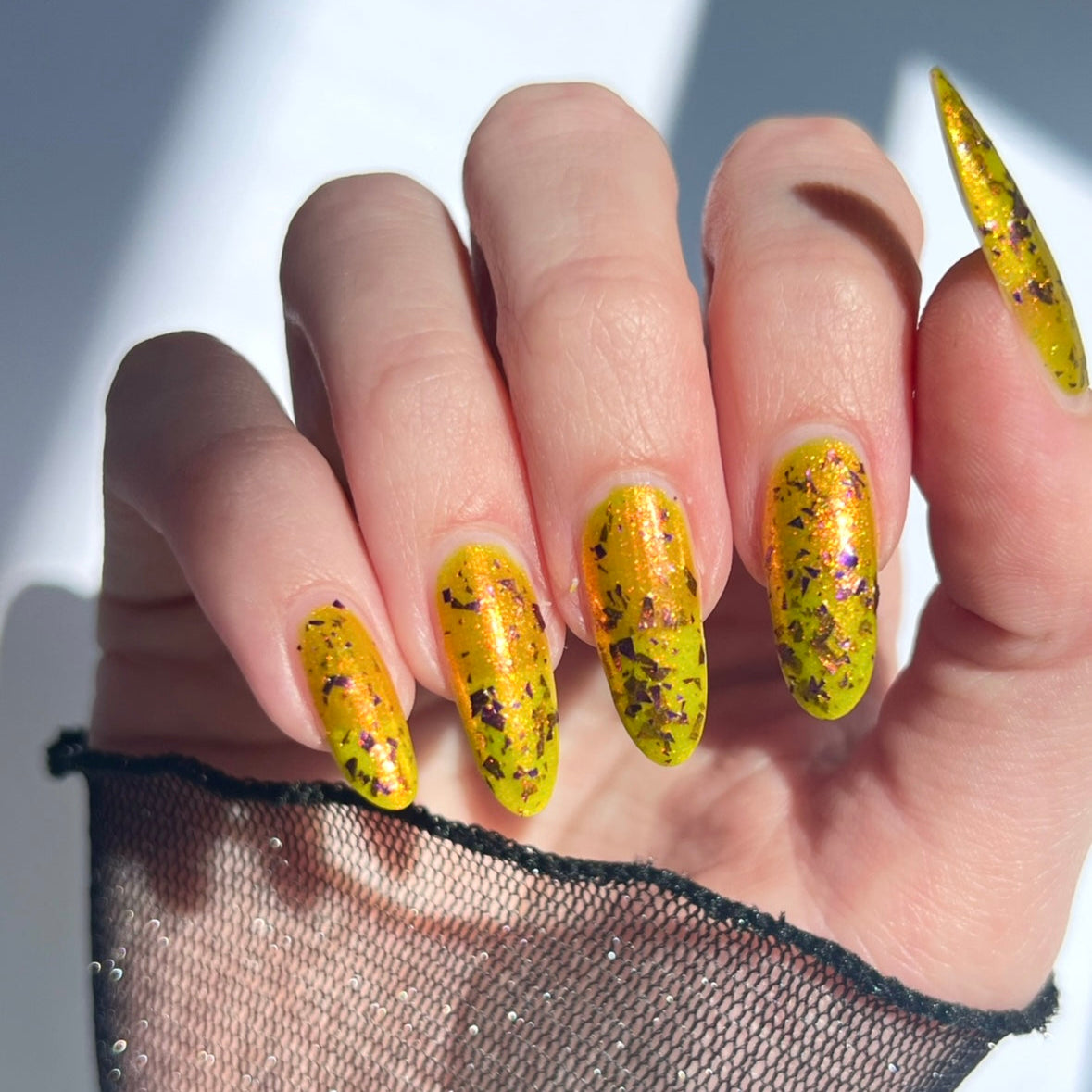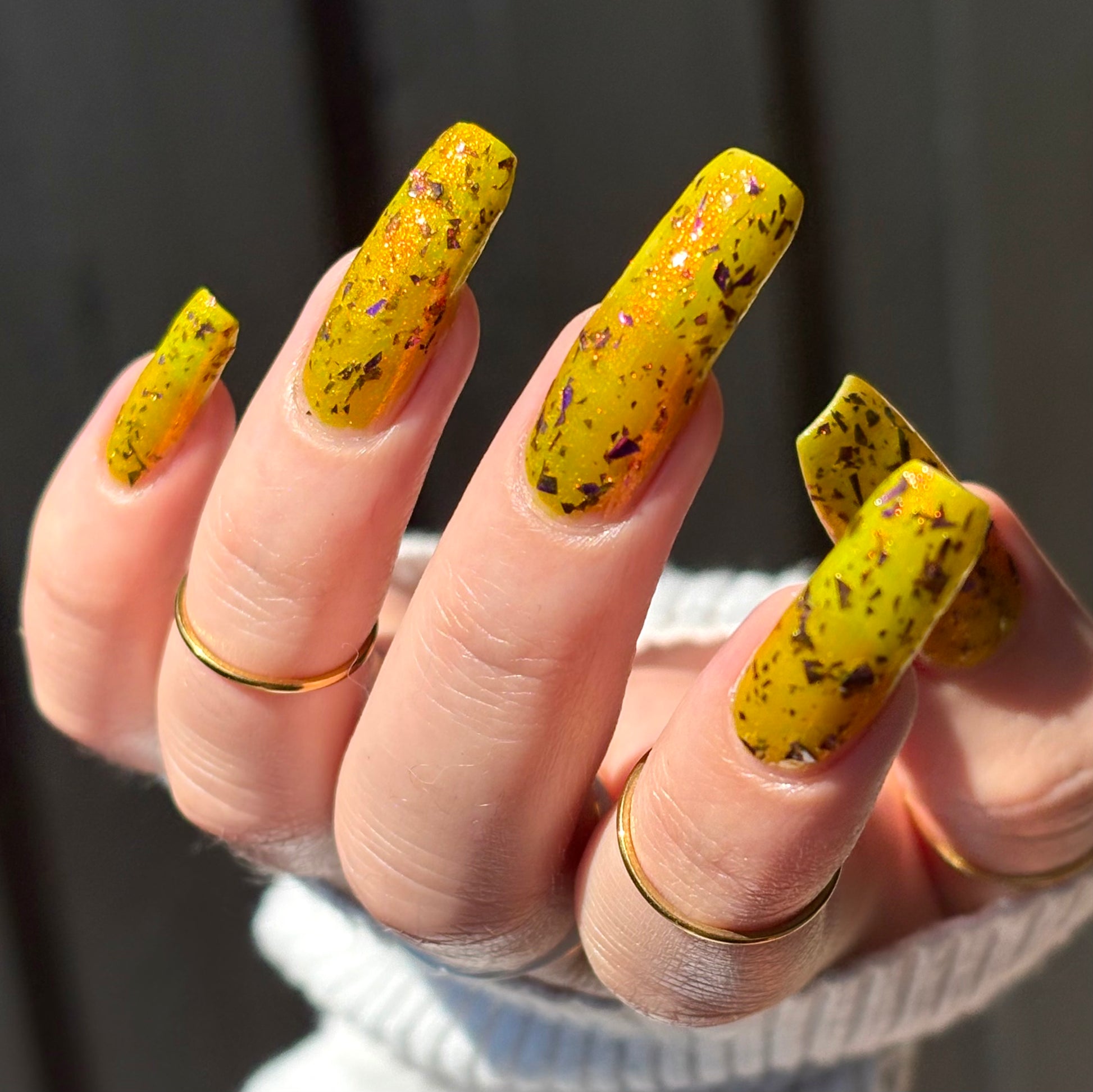Note: Due to the amount of flakes in this polish, we recommend waiting for your first coat to dry completely before going in with your second coat of polish. Some may want to use a glitter-smoothing topcoat as well to avoid texture from the large flakes.