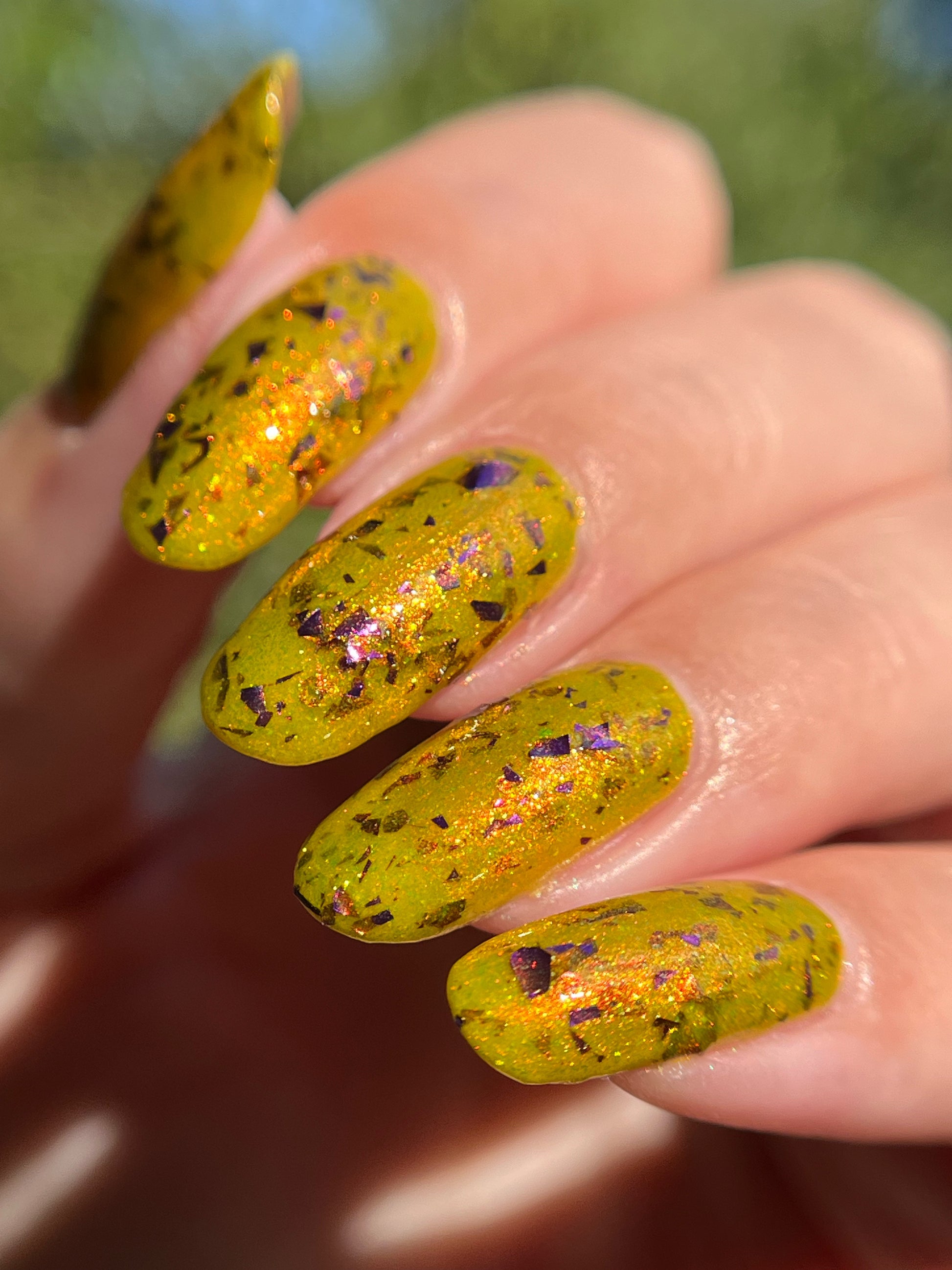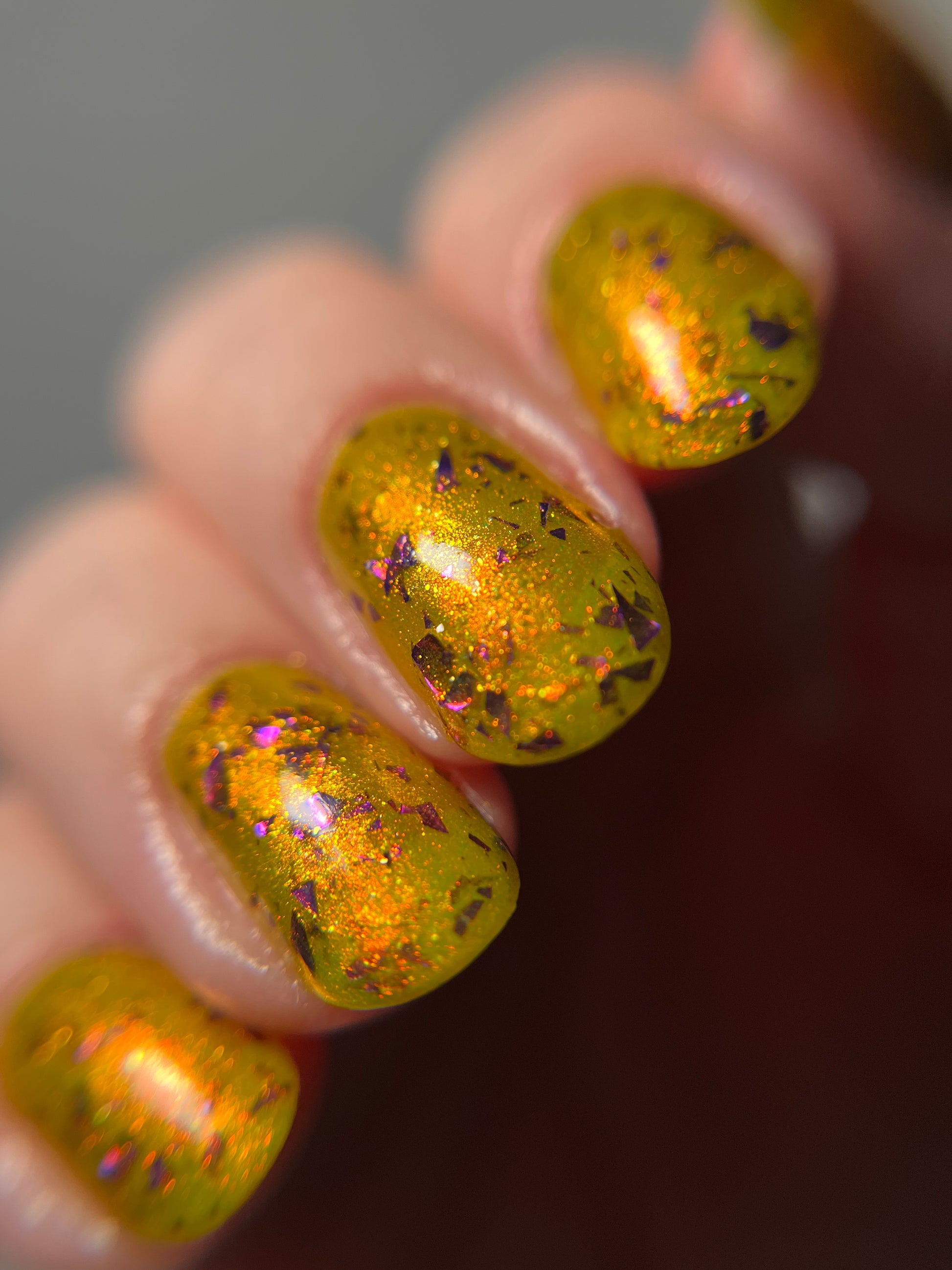 Pepper-Upper is described as a yellowy-green polish with an orange/red shifting shimmer and purple flakes.