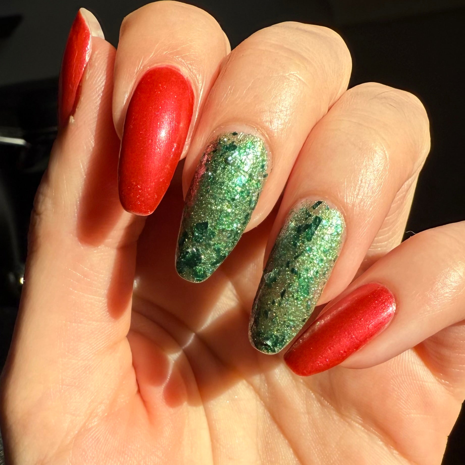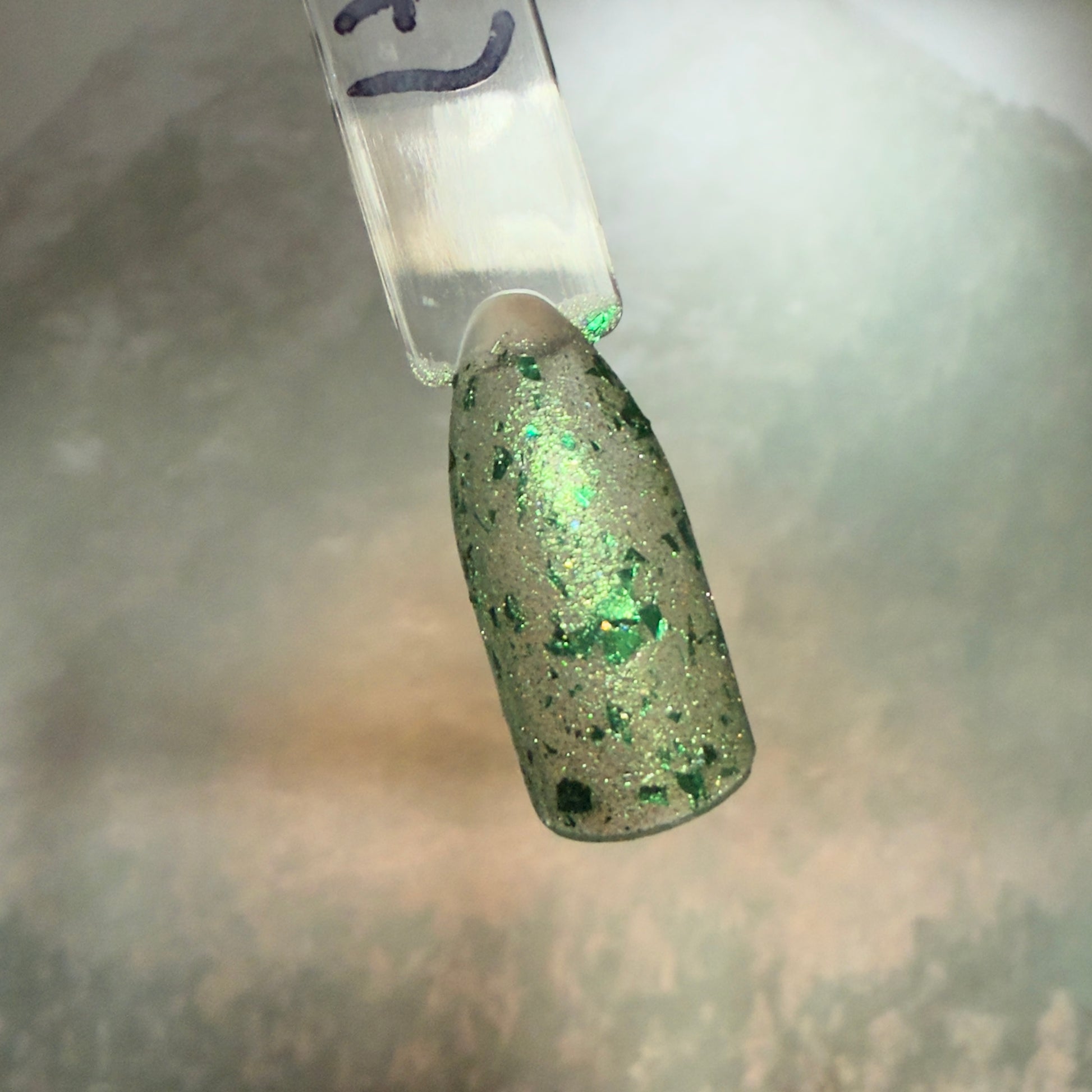 Description: A fun, shimmery polish packed with various different flakes and glitter. This shade can be worn in 1-2 coats, depending on preference. The swatch stick is shown with 1 coat, @leahs.lacquer is wearing 2 coats. (Small Batch)